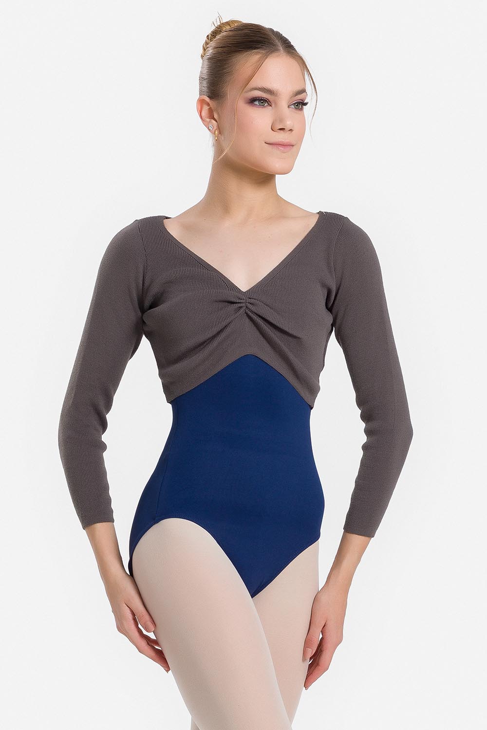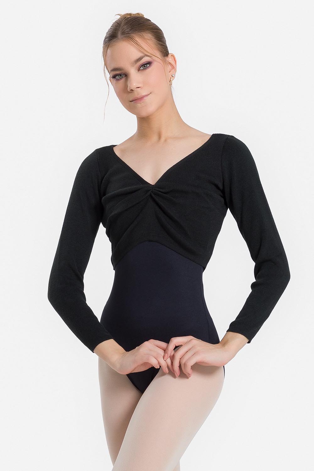 Blusa corta femenina adulto con mangas 7/8, escote V y fruncido delantero. Hecha en hilo acrílico para calentamiento y libertad de movimientos. Disponible en 4 colores