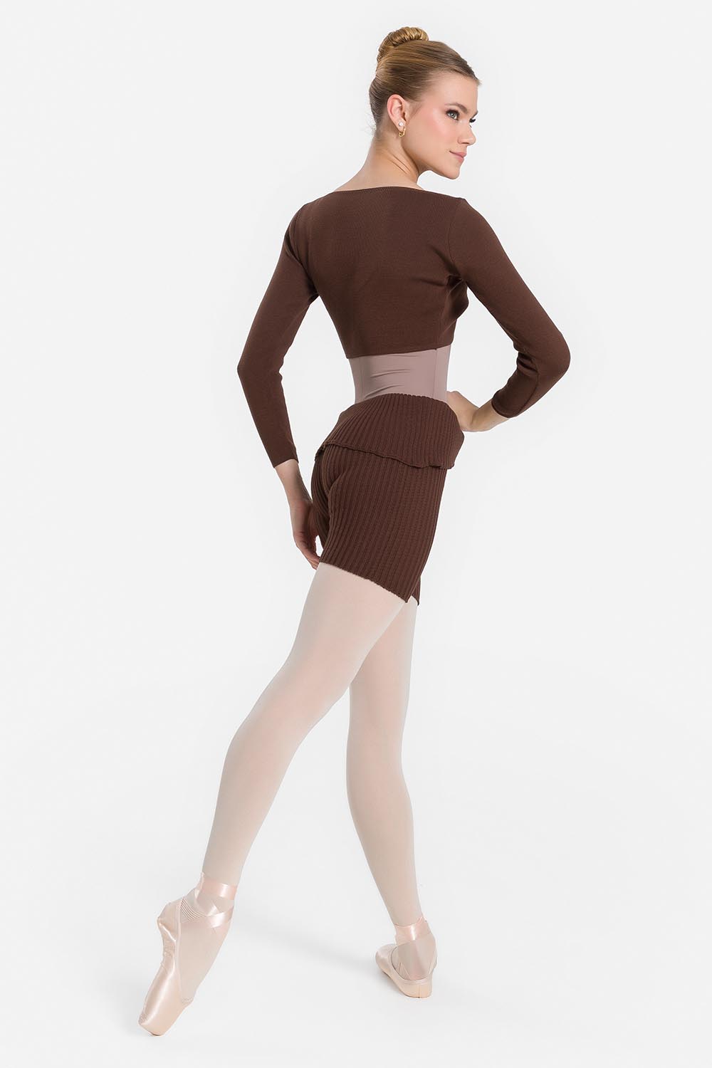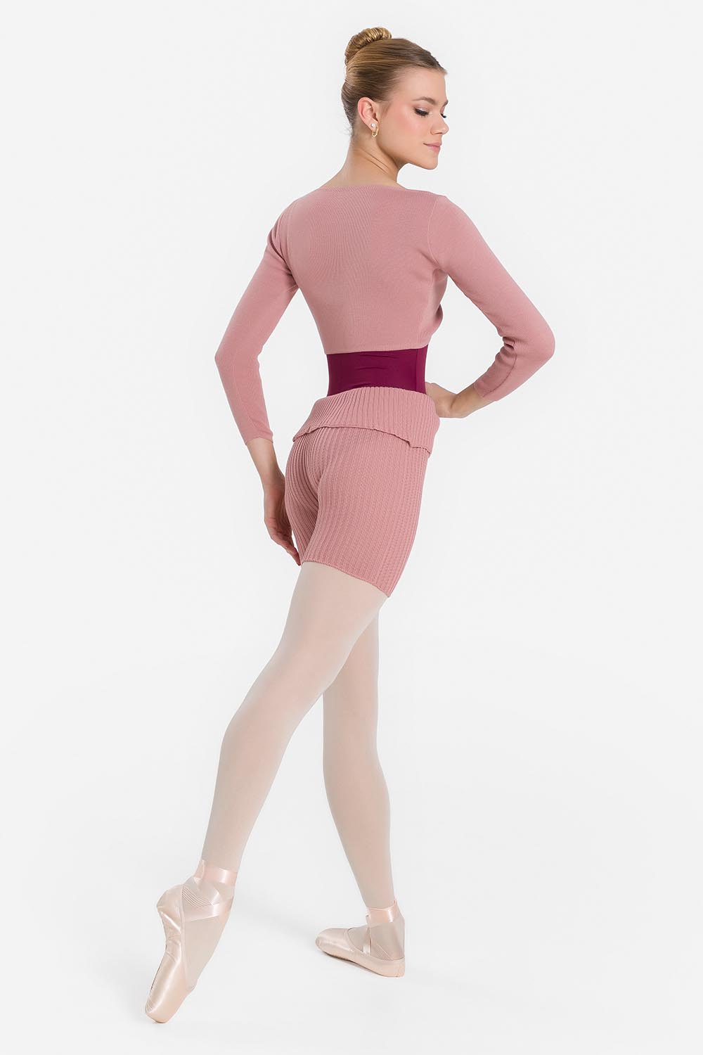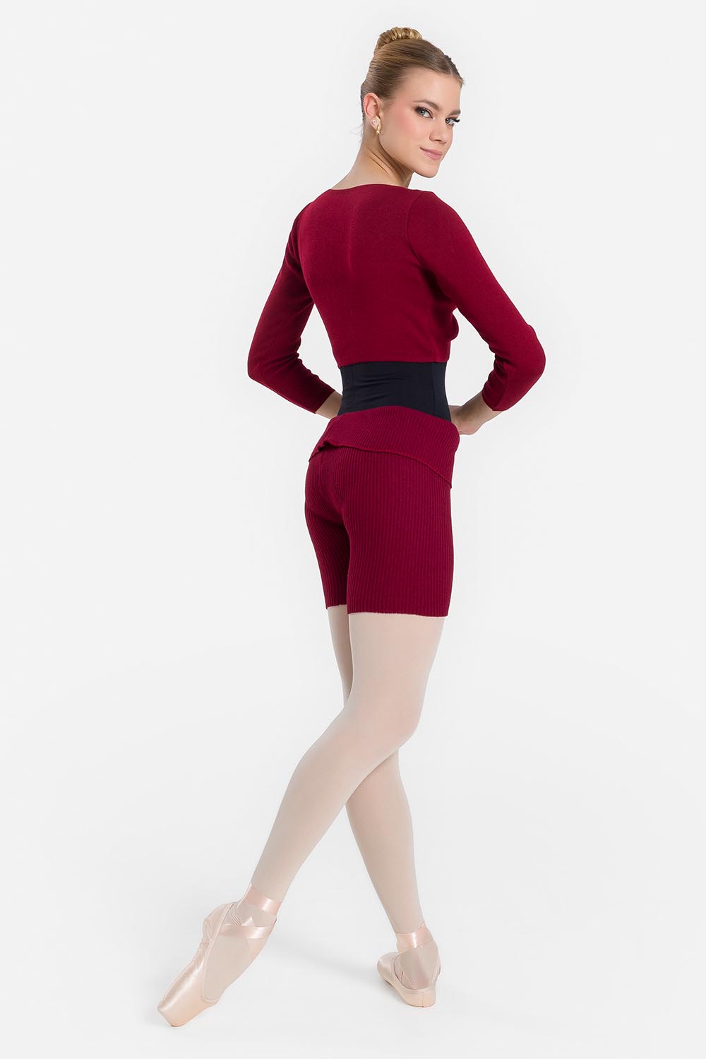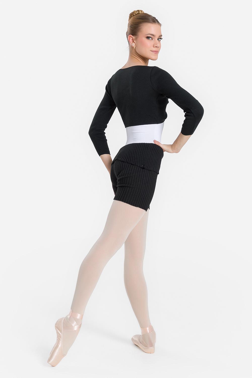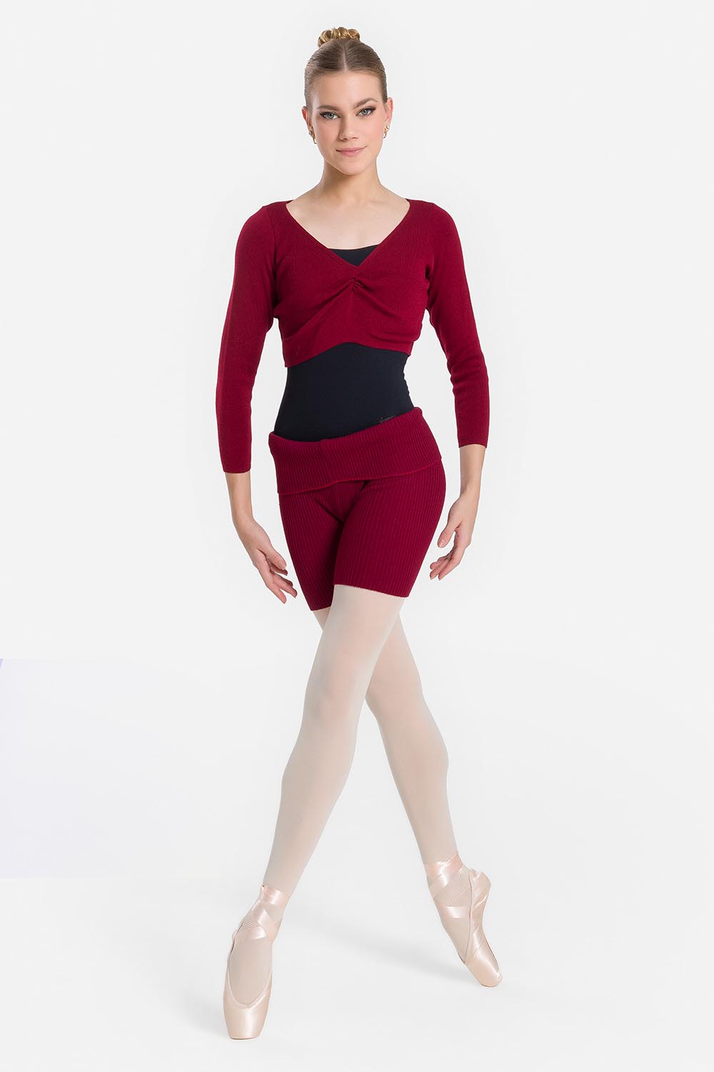 Blusa corta femenina adulto con mangas 7/8, escote V y fruncido delantero. Hecha en hilo acrílico para calentamiento en combinación con el exclusivo moldeado Só Dança para que la bailarina se sienta totalmente libre para moverse con más seguridad y comodidad.