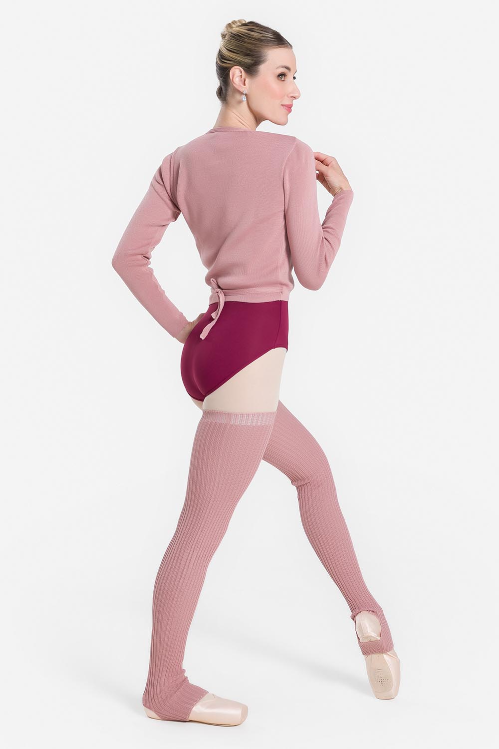 Chaqueta femenina adulto con traslapado delantero y cordón para amarre. Hecha en hilo acrílico para calentamiento y libertad de movimientos.
