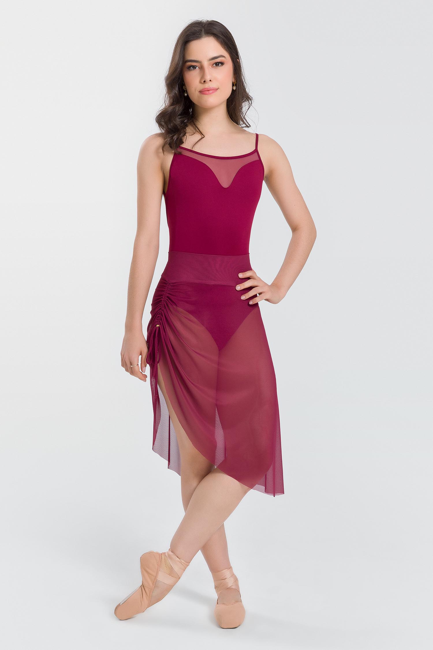 Falda adulto con pretina elástica y cordón con adorno Só Dança para fruncir uno de los lados. Hecha en tul elástico para brindar excelente caída y sofisticada transparencia.