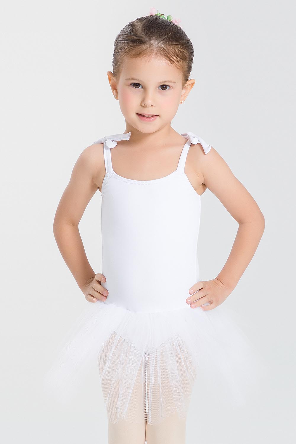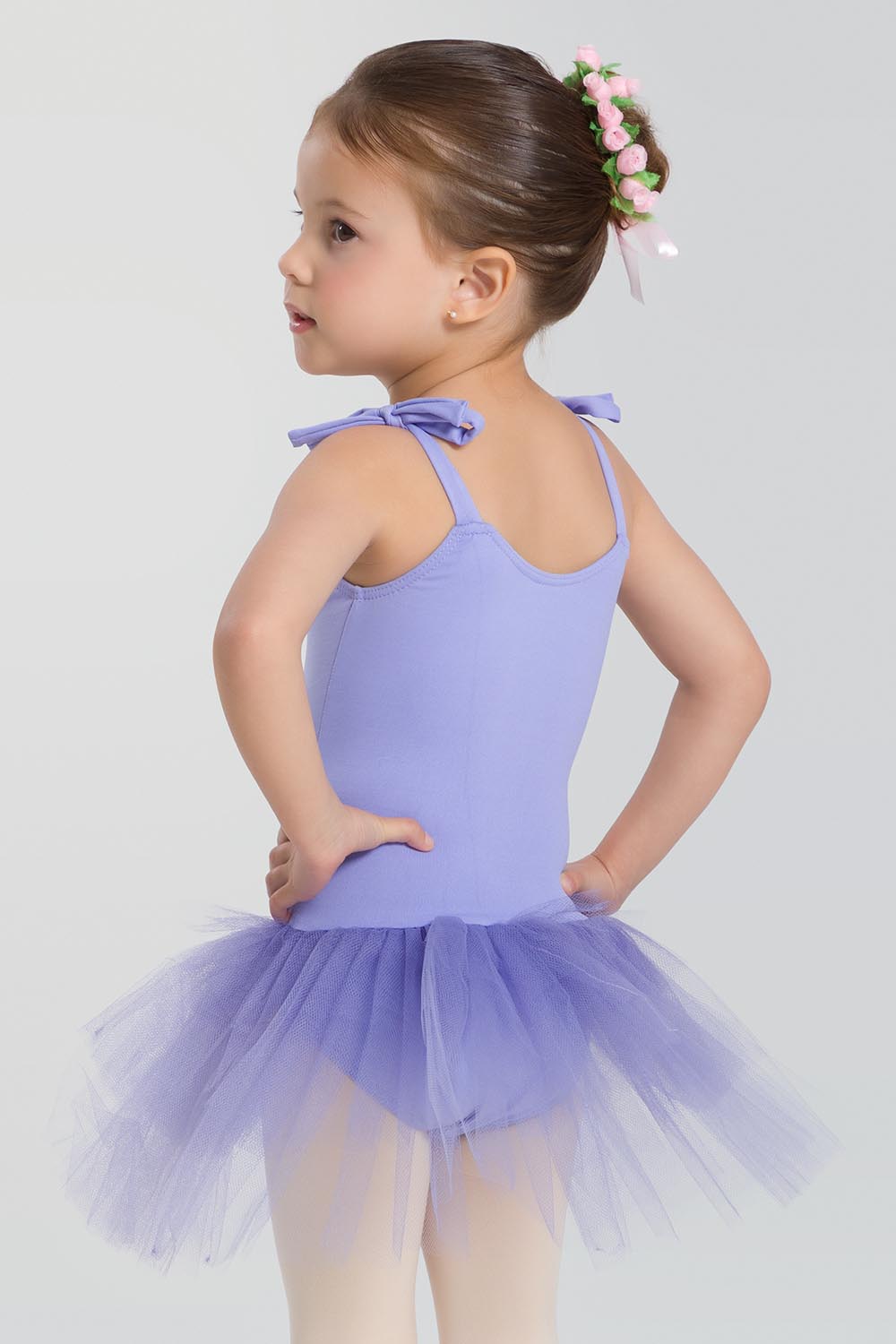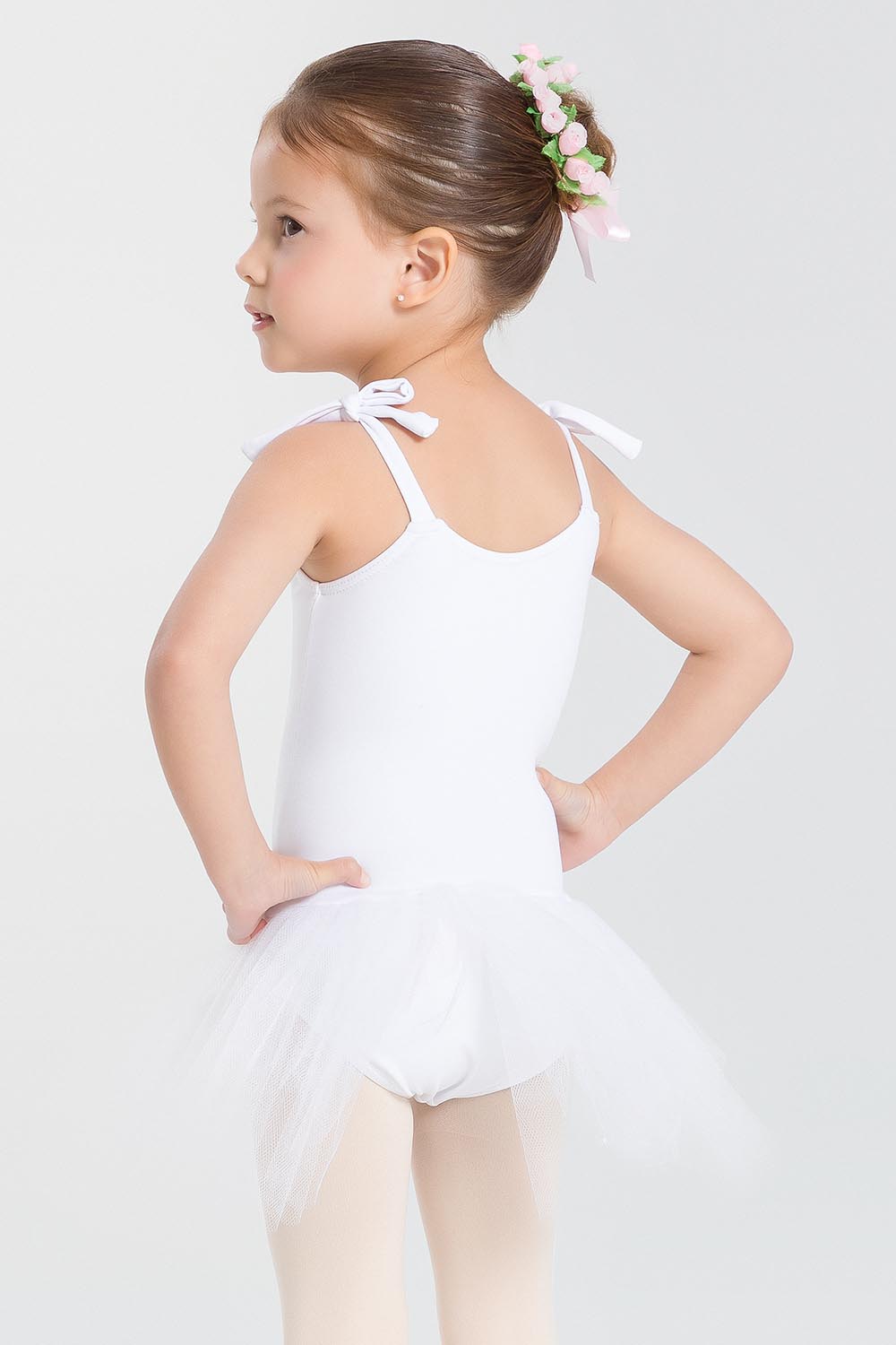 Leotardo con falda en tallas infantil. Con anchos tirantes para amarrar en los hombros y falda volante de tul. Hecho en tela microfibra con elastano en combinación con el exclusivo moldeado Só Dança para que la bailarina se mueva libremente mientras los dobladillos se mantienen fijos en sus debidos lugares, garantizando más comodidad y seguridad.