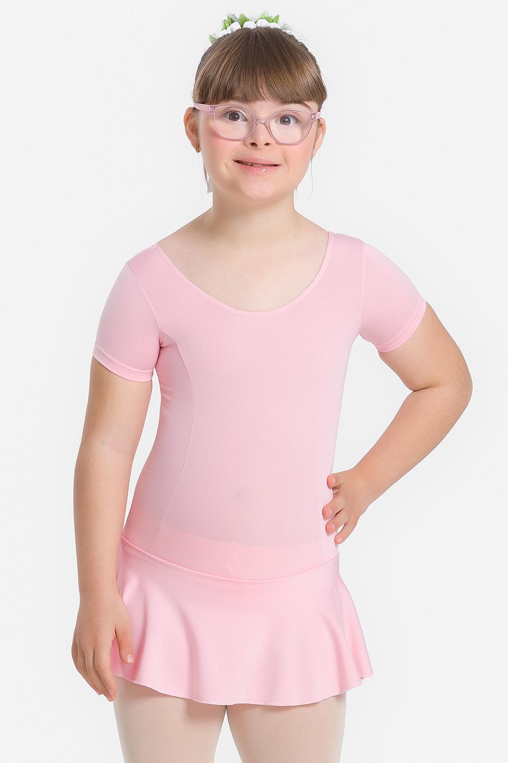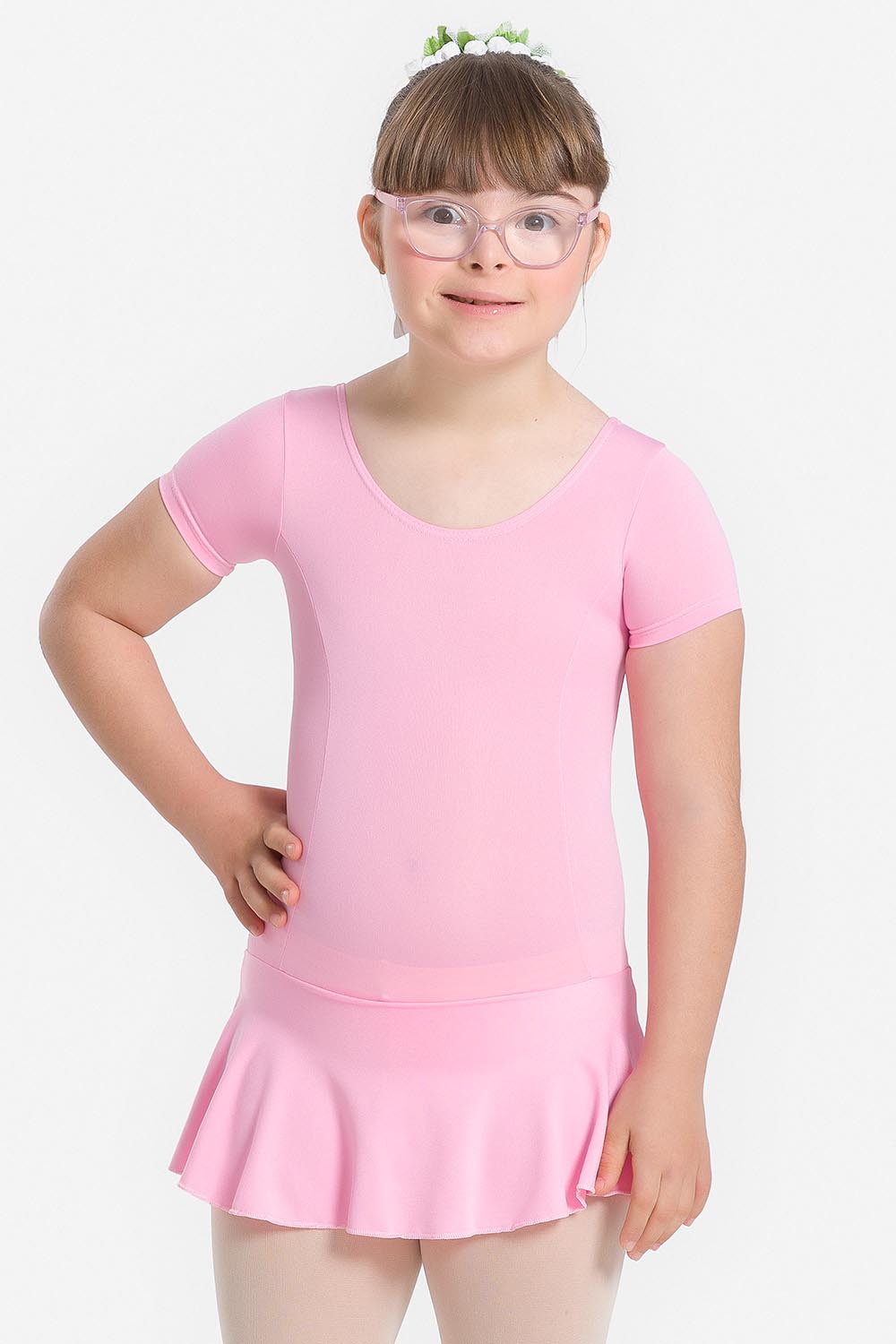 Leotardo con falda en tallas infantil y adulto. Con mangas cortas, escote redondo y falda. Hecho en tela Microfibra Stretch con falda para ofrecer libertad de movimiento y seguridad.