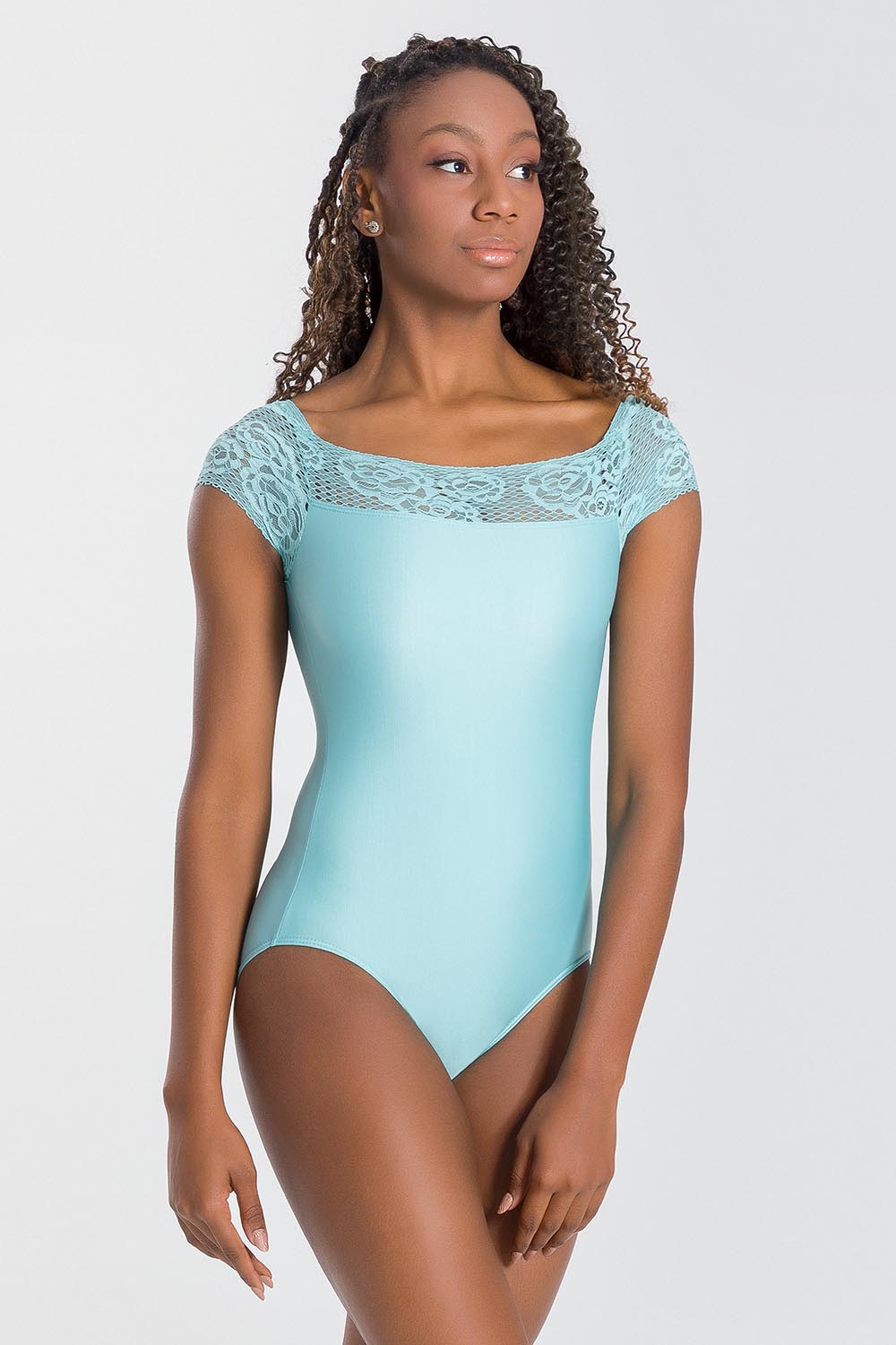 Leotardo femenino adulto de escote canoa, con mangas casquillo, parte de arriba del busto y de la espalda hechos en encaje. Hecho en tela microfibra con elastano en combinación con el exclusivo moldeado Só Dança para que la bailarina se mueva libremente mientras los dobladillos se mantienen fijos en sus debidos lugares, garantizando más comodidad y seguridad.