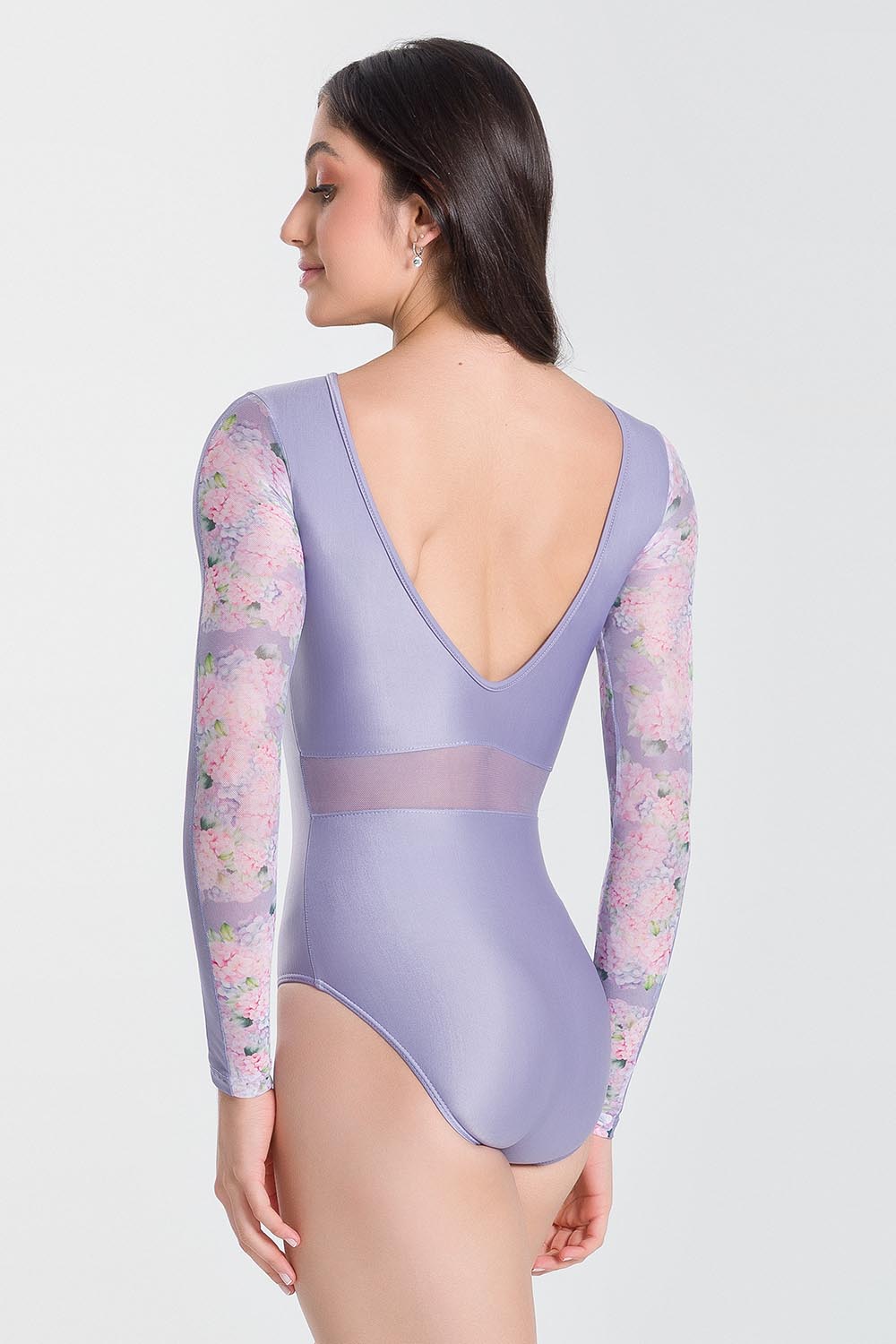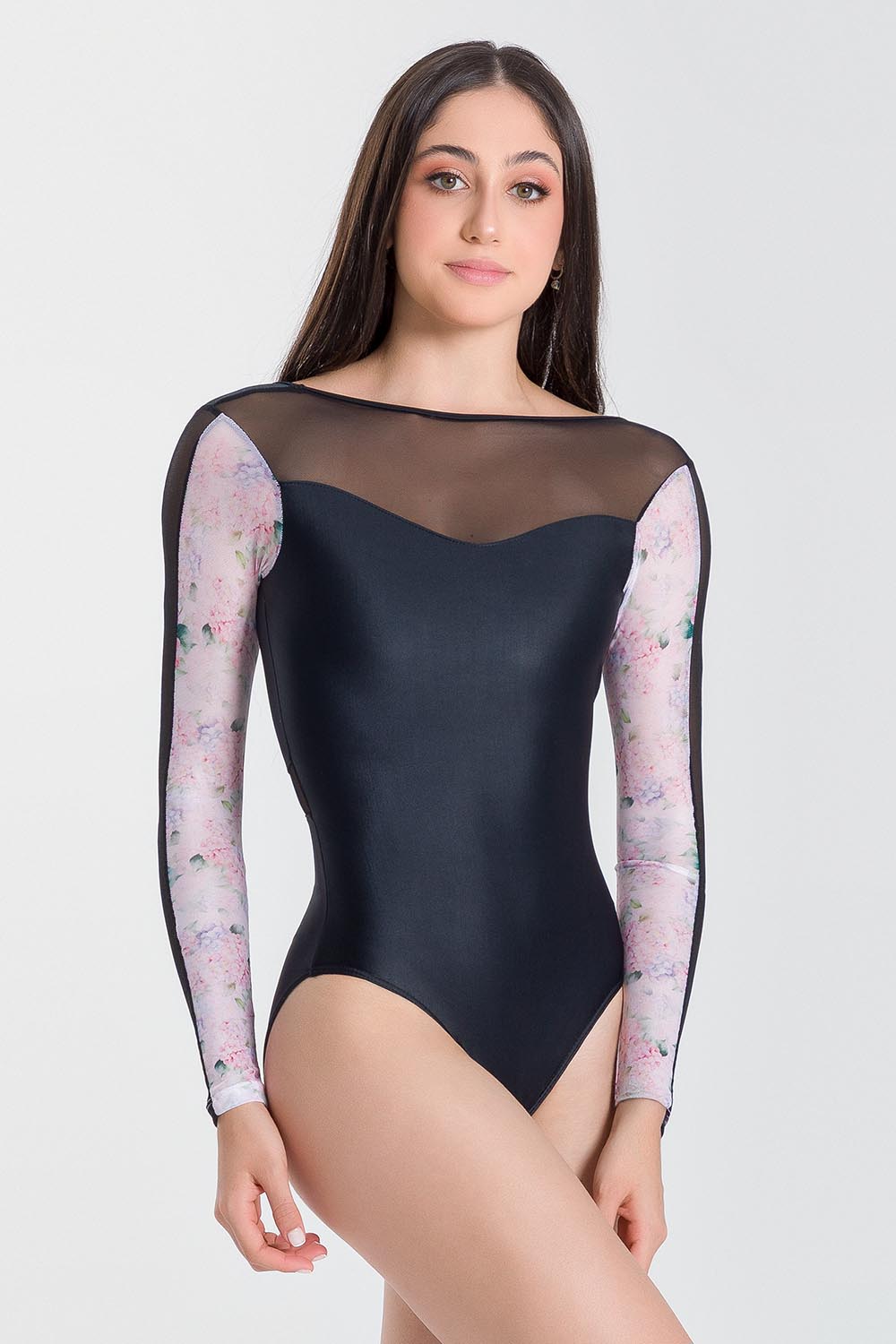 Leotardo femenino adulto de mangas largas con amplio escote V en la espalda, tul elástico de moderno estampado en los brazos y tul elástico del mismo color de la tela en el escote delantero y detalle de la espalda. Hecho en tela microfibra con elastano en combinación con el exclusivo moldeado Só Dança para que la bailarina se mueva libremente mientras los dobladillos se mantienen fijos en sus debidos lugares, garantizando más comodidad y seguridad.