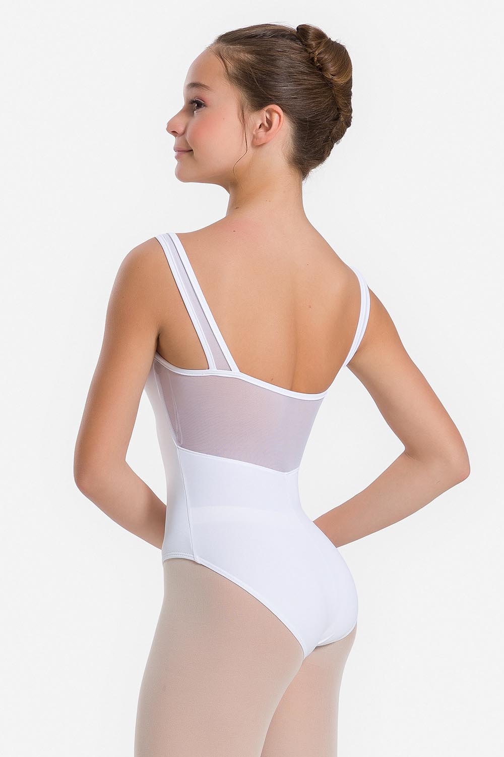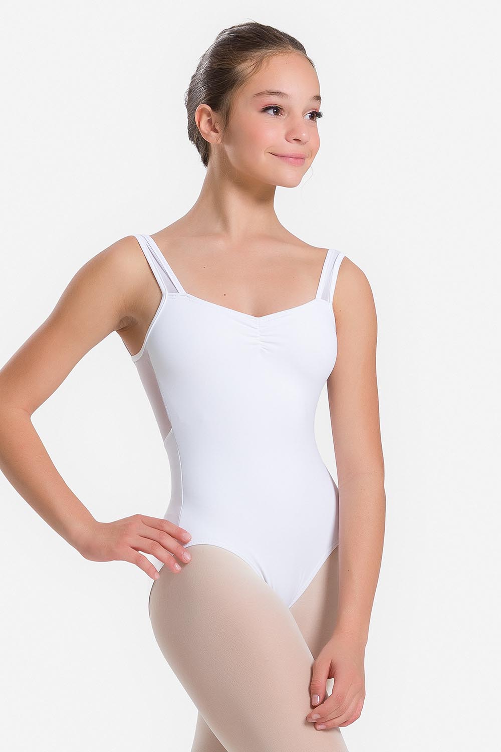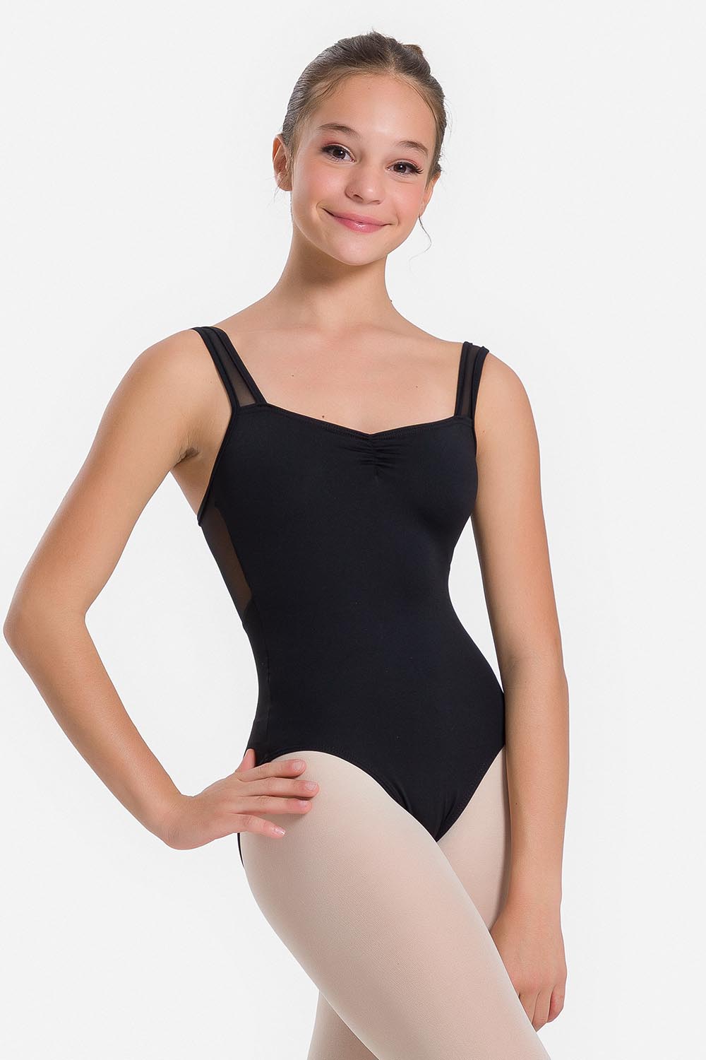 Leotardo femenino adulto con tirantes anchos y fruncido en el escote delantero. Escote recto y recorte de tul elástico insertado en la espalda. Hecho en tela de microfibra con elastano y el exclusivo moldeado Só Dança, que mantiene los dobladillos en sus lugares, para ofrecer a la bailarina total libertad de movilidad y promover la sensación de bienestar y seguridad.