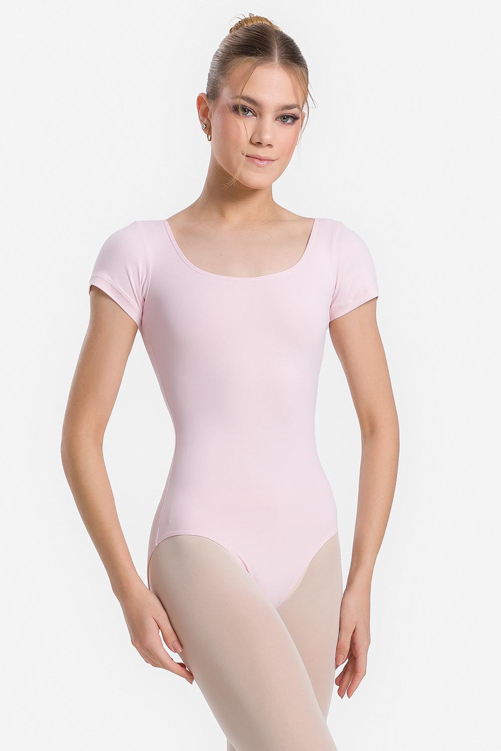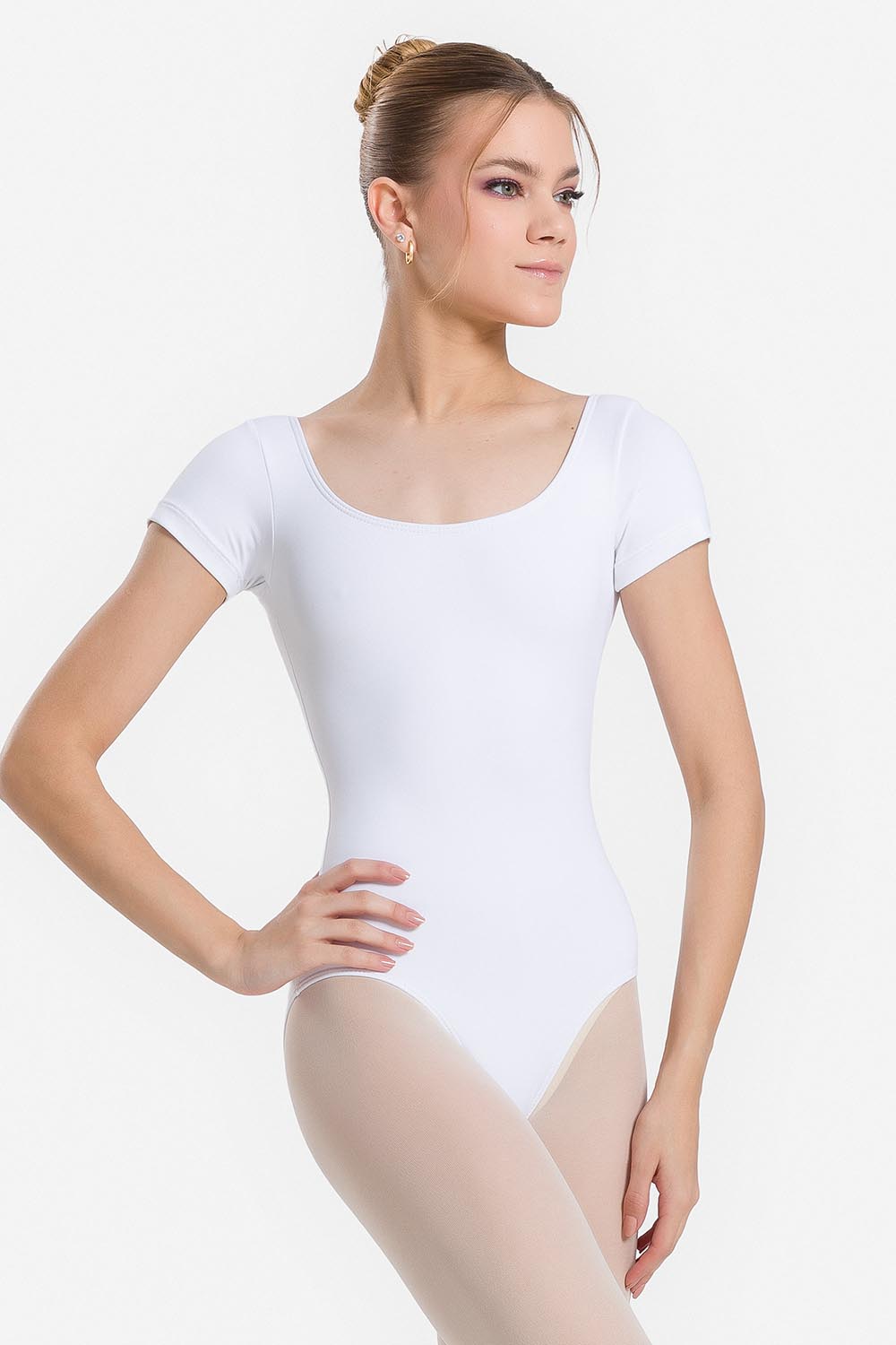 Leotardo femenino adulto con mangas cortas y escote redondo. Hecho en tela microfibra con elastano en combinación con el exclusivo moldeado Só Dança para darle a la bailarina movilidad total y mantener los dobladillos fijos en sus debidos lugares a un solo tiempo, garantizando más comodidad y seguridad.