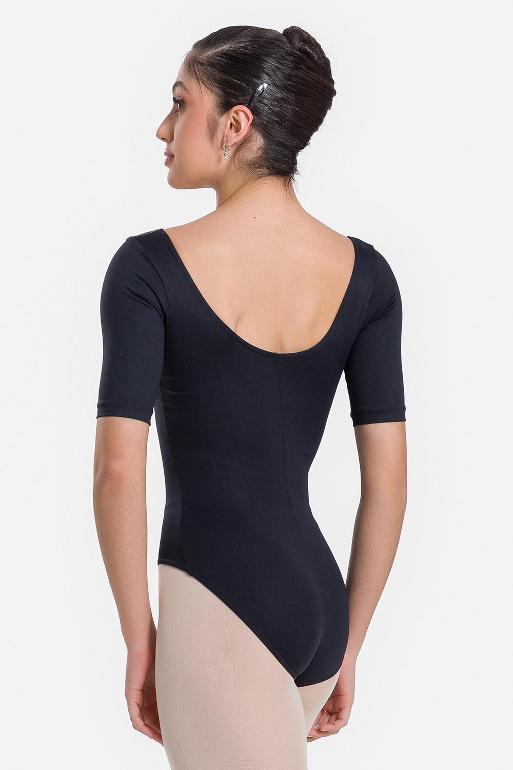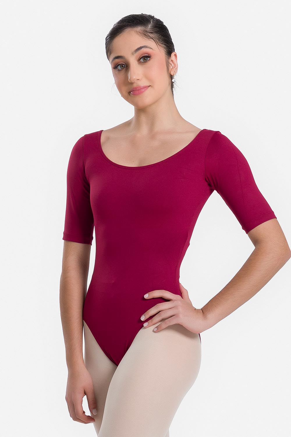 Leotardo femenino adulto de mangas hasta los codo y escote redondo. Hecho en tela microfibra con elastano en combinación con el exclusivo moldeado Só Dança para que la bailarina tenga total libertad para moverse mientras los dobladillos se mantienen fijos en sus debidos lugares, garantizando más comodidad y seguridad.