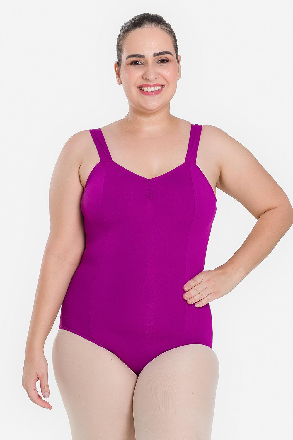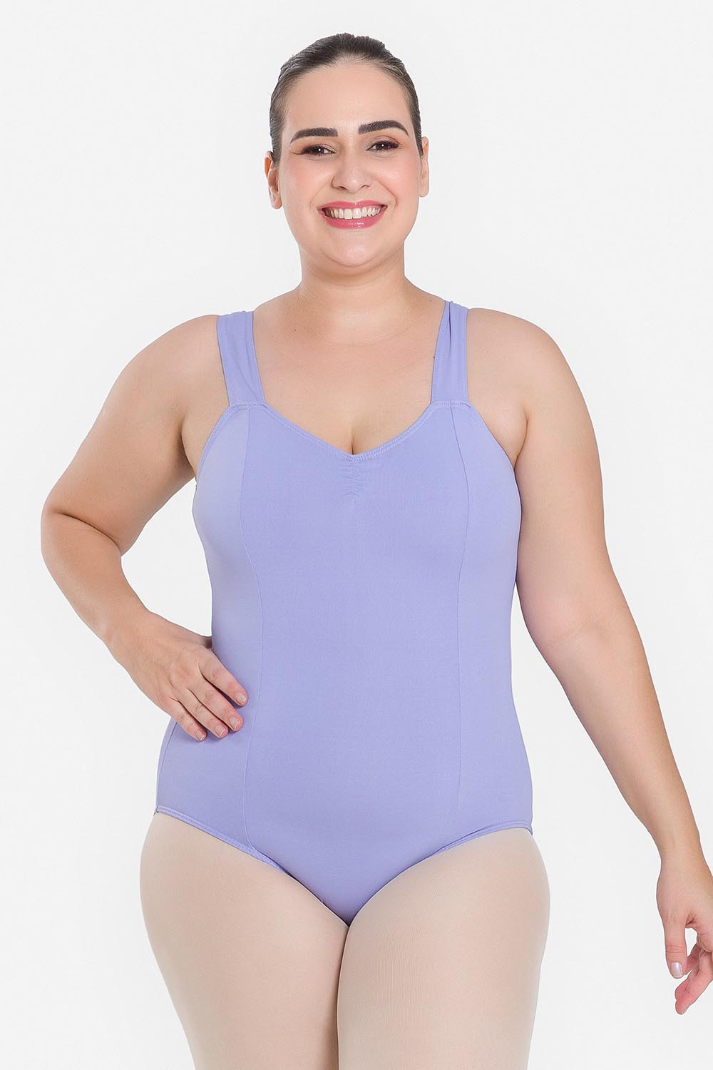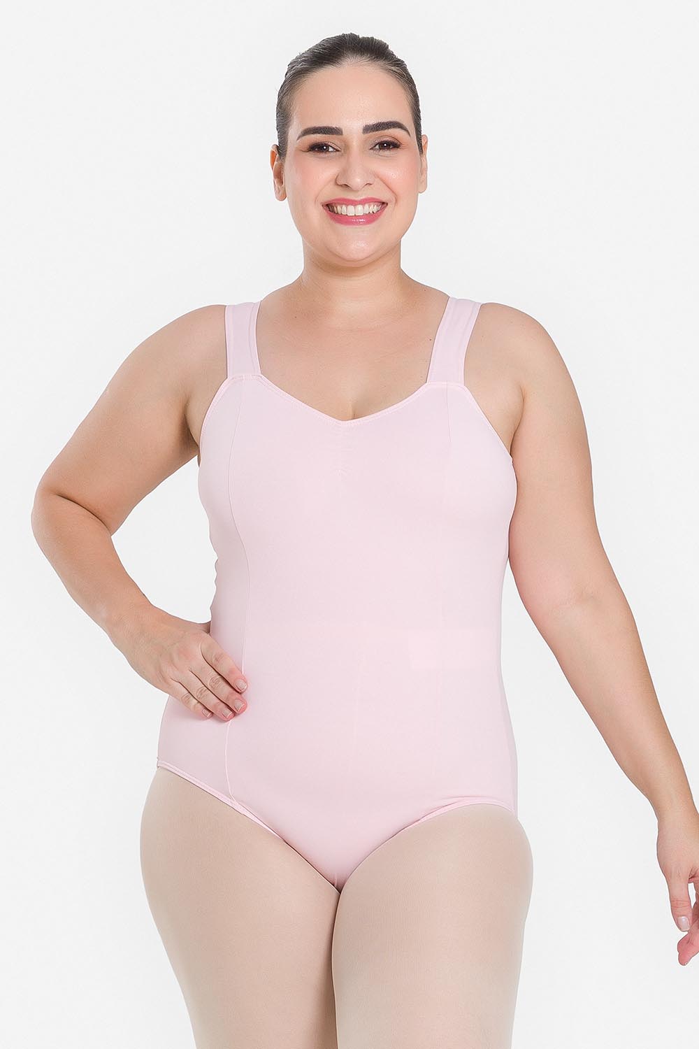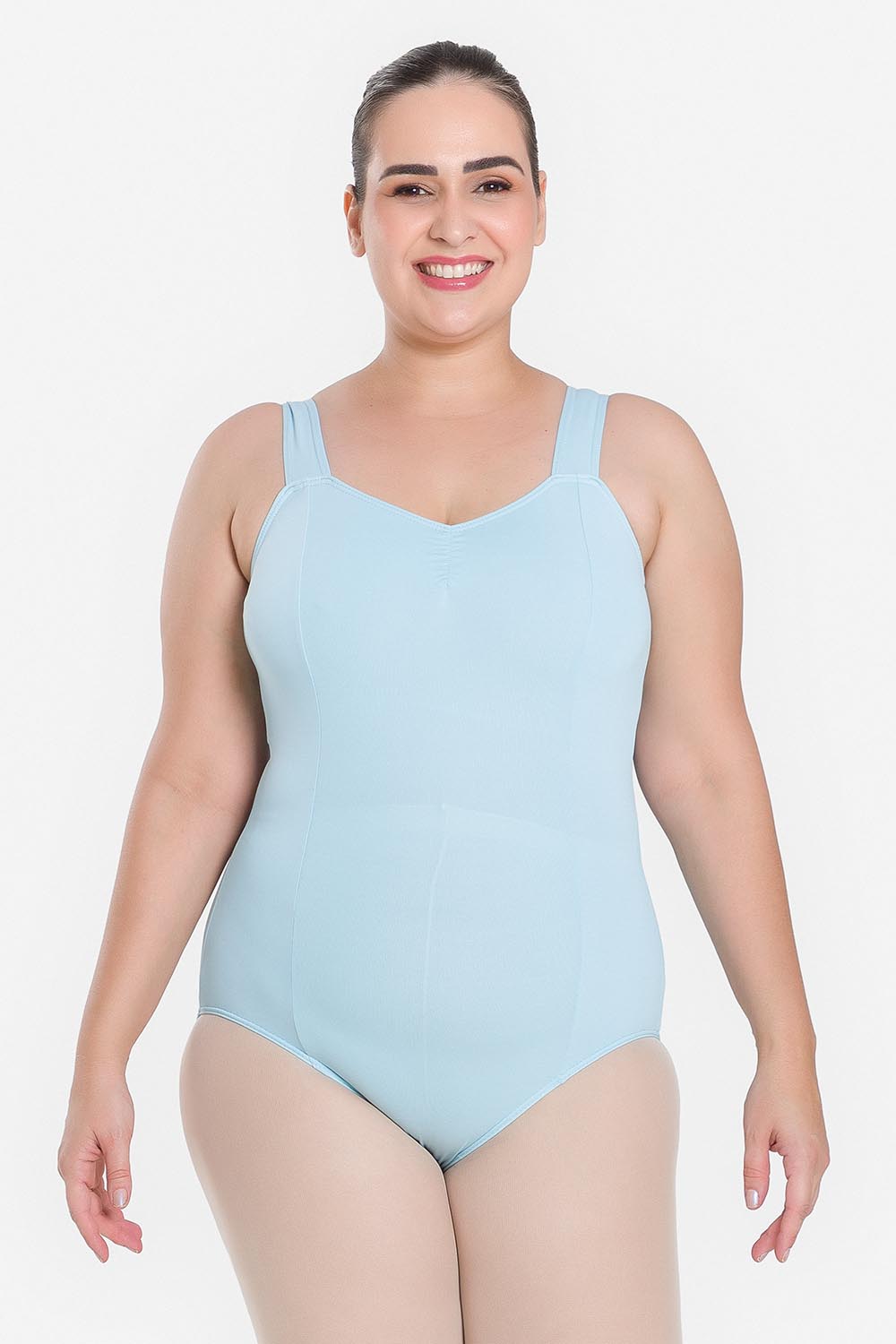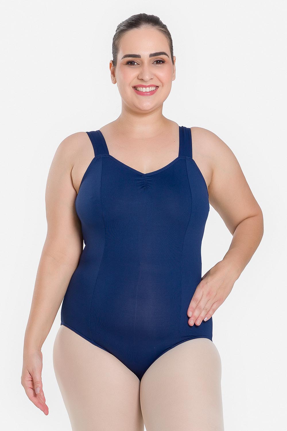 Leotardo femenino adulto en tallas cuvilineas, con moldeado básico de tirantes anchos y escote redondo. Hecho en tela de microfibra con elastano y el exclusivo moldeado Só Dança, que mantiene los dobladillos en sus lugares, dándole a la bailarina total libertad de movimientos y promoviendo la sensación de bienestar y seguridad.
