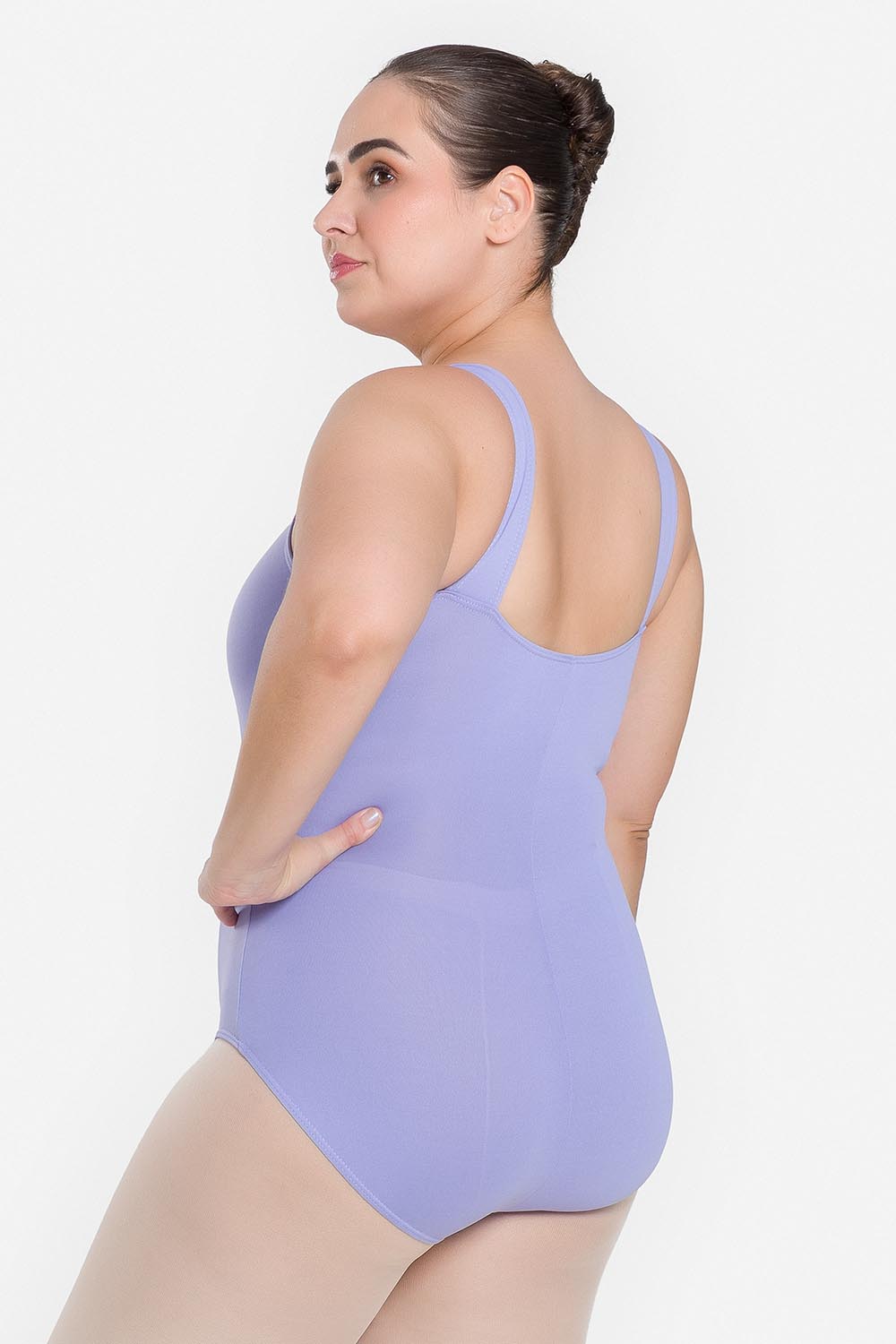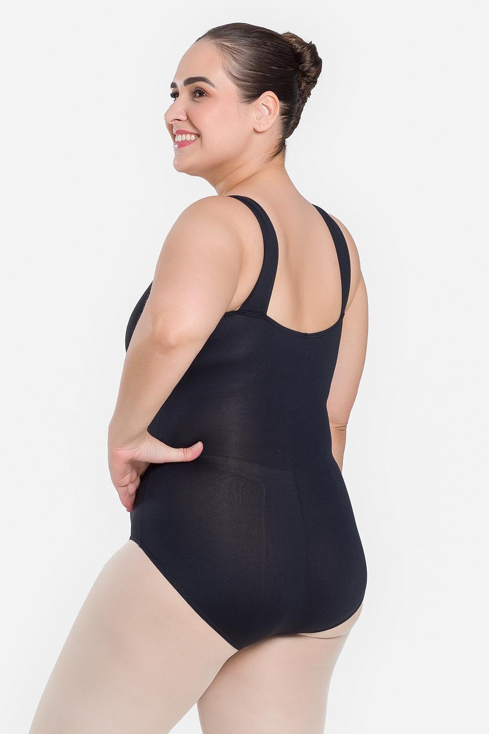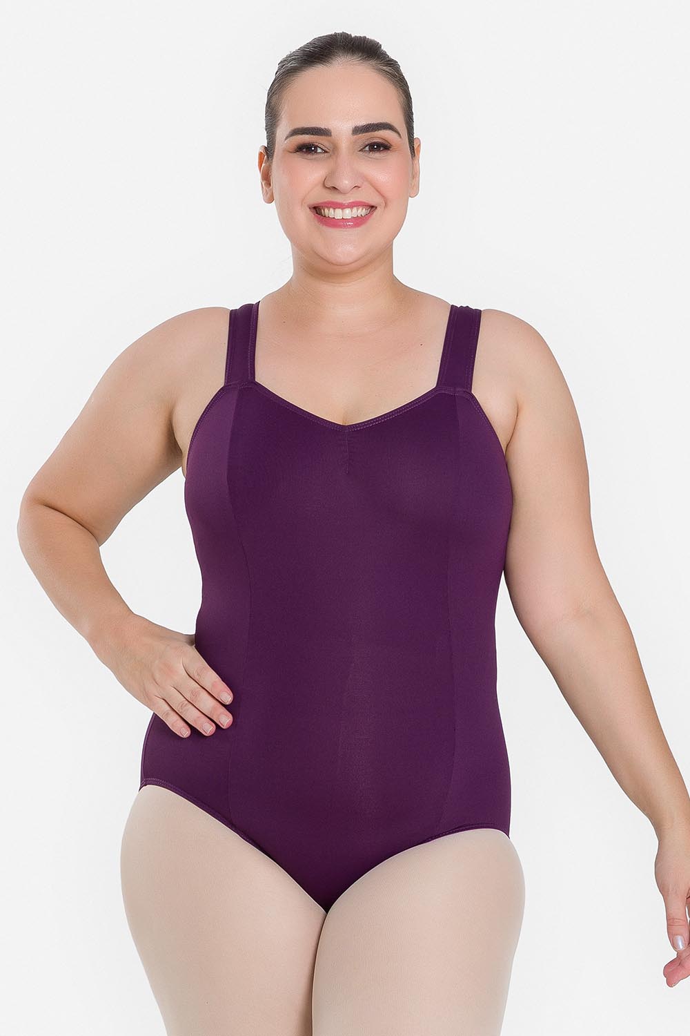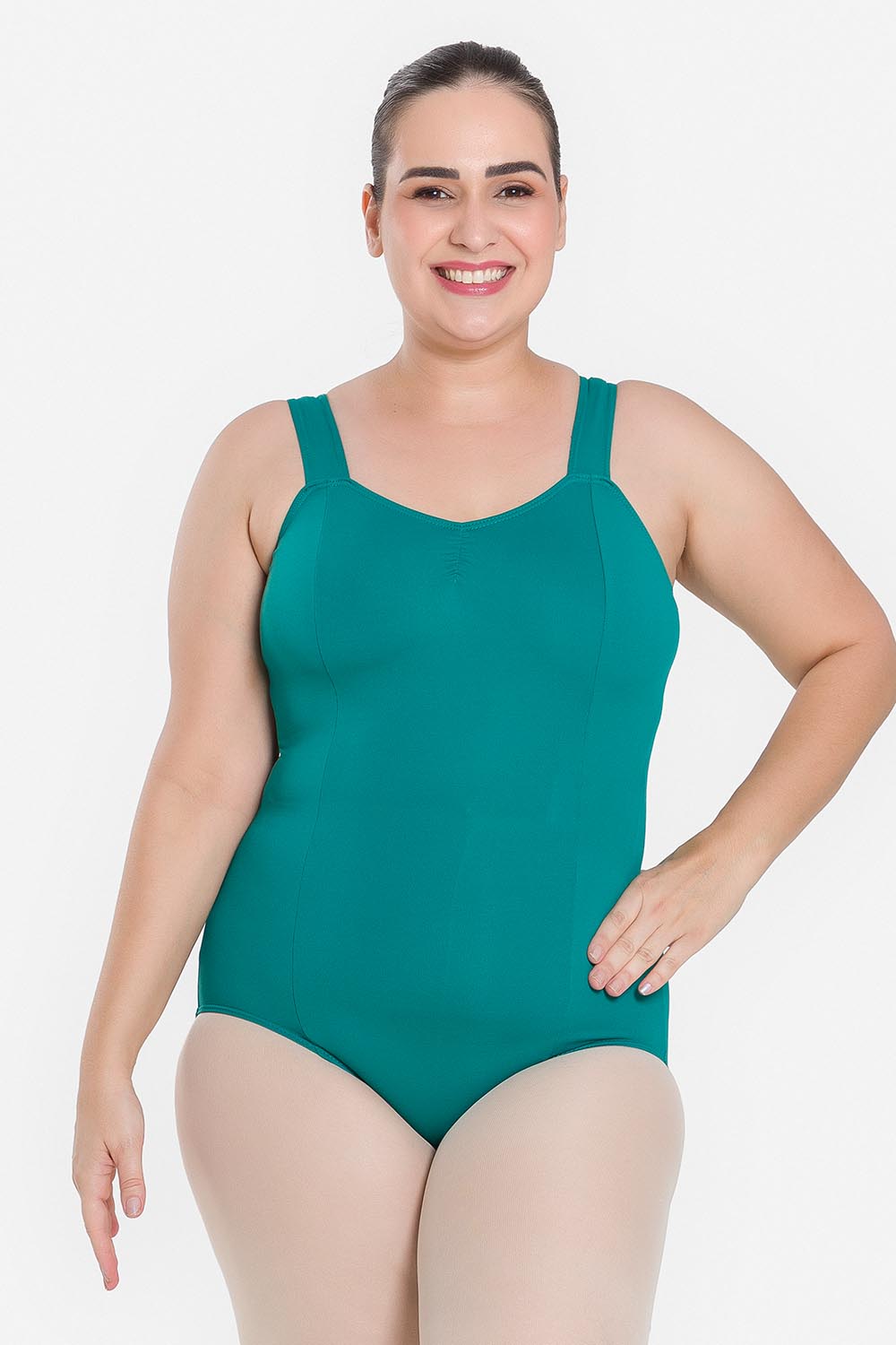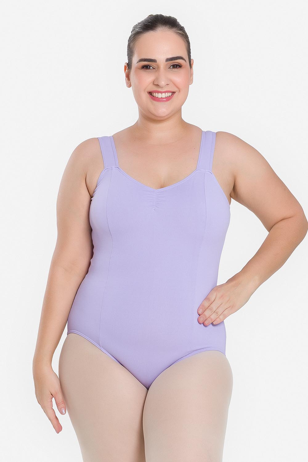Leotardo femenino adulto en tallas cuvilineas, con moldeado básico de tirantes anchos y escote redondo. Hecho en tela de microfibra con elastano y el exclusivo moldeado Só Dança, que mantiene los dobladillos en sus lugares, dándole a la bailarina total libertad de movimientos y promoviendo la sensación de bienestar y seguridad.