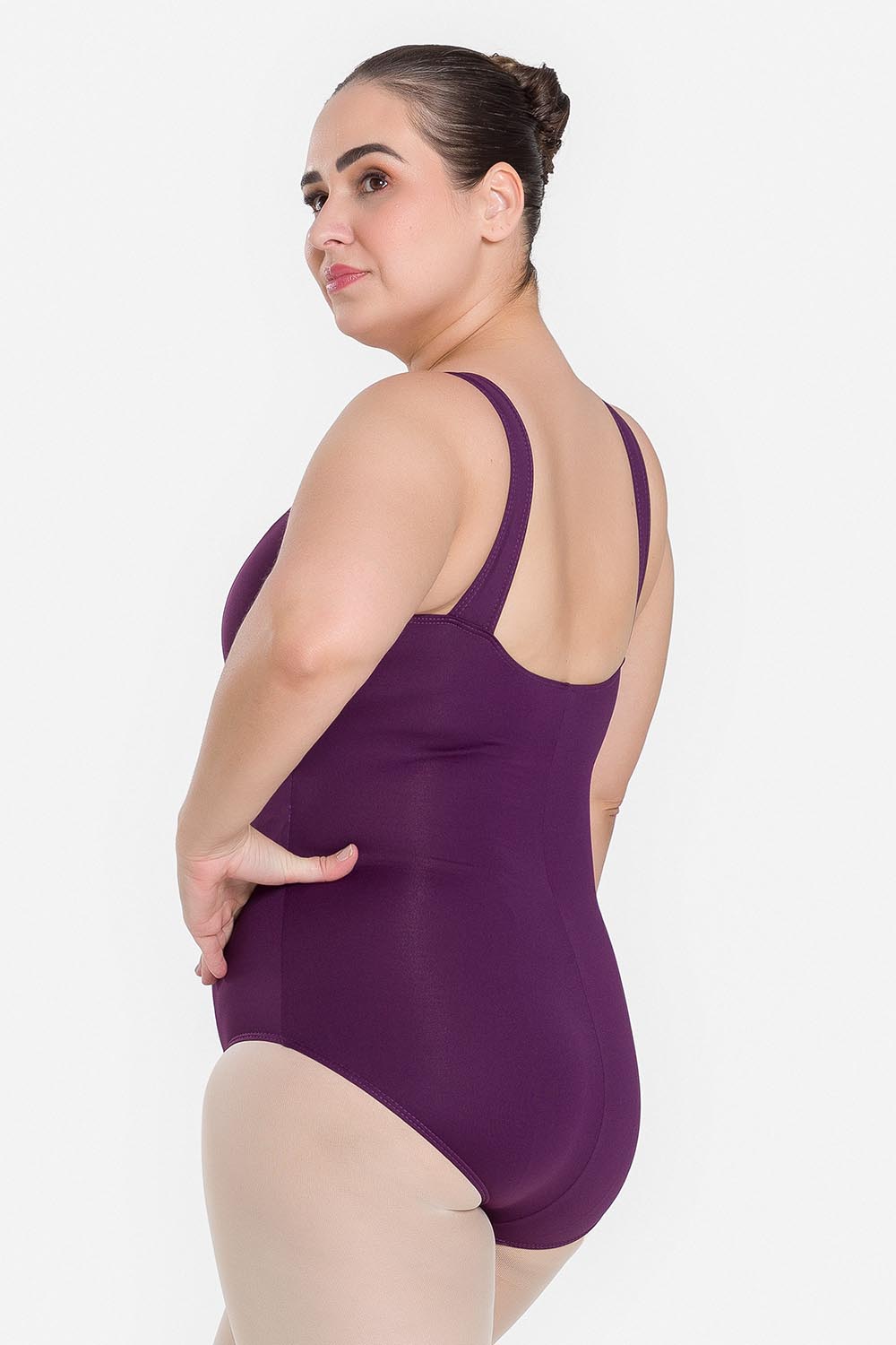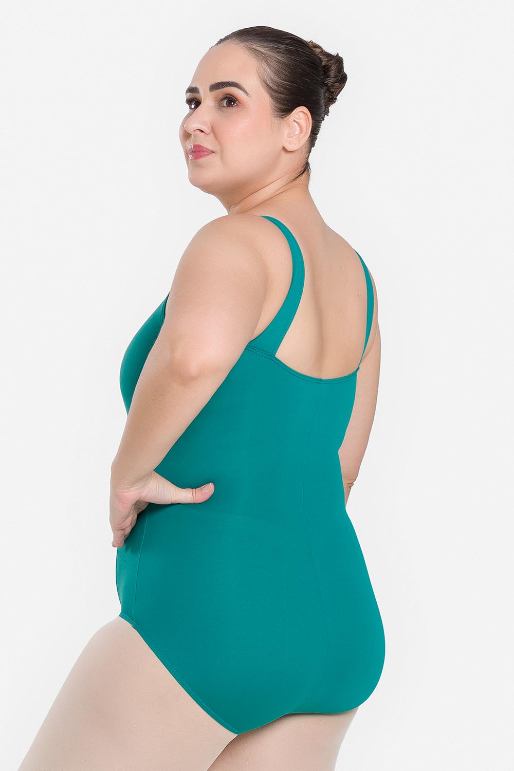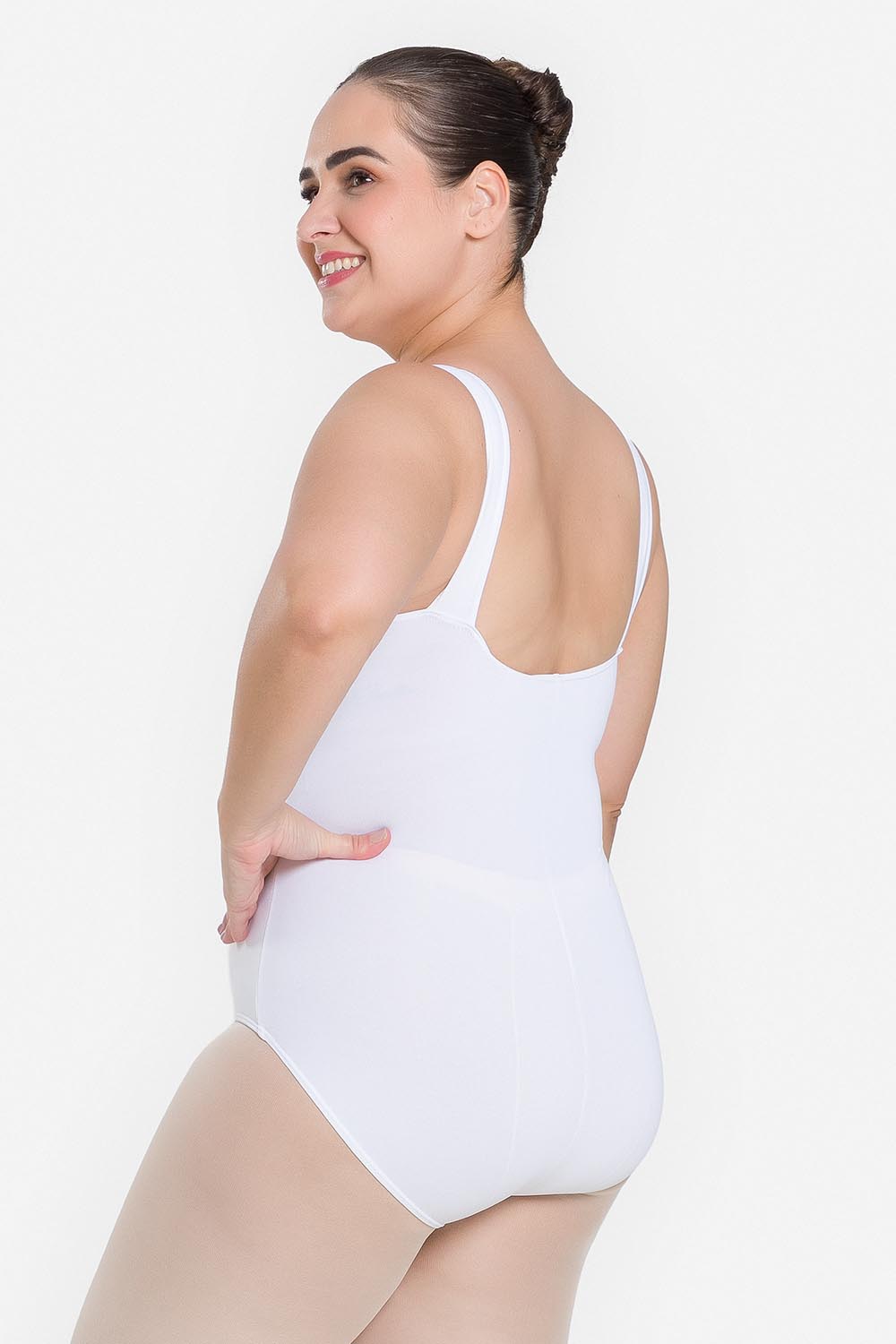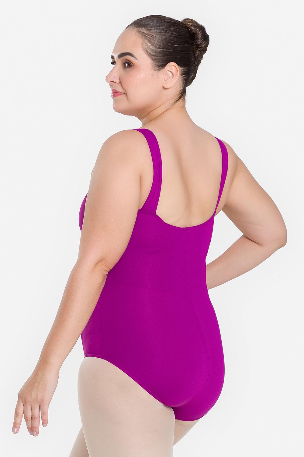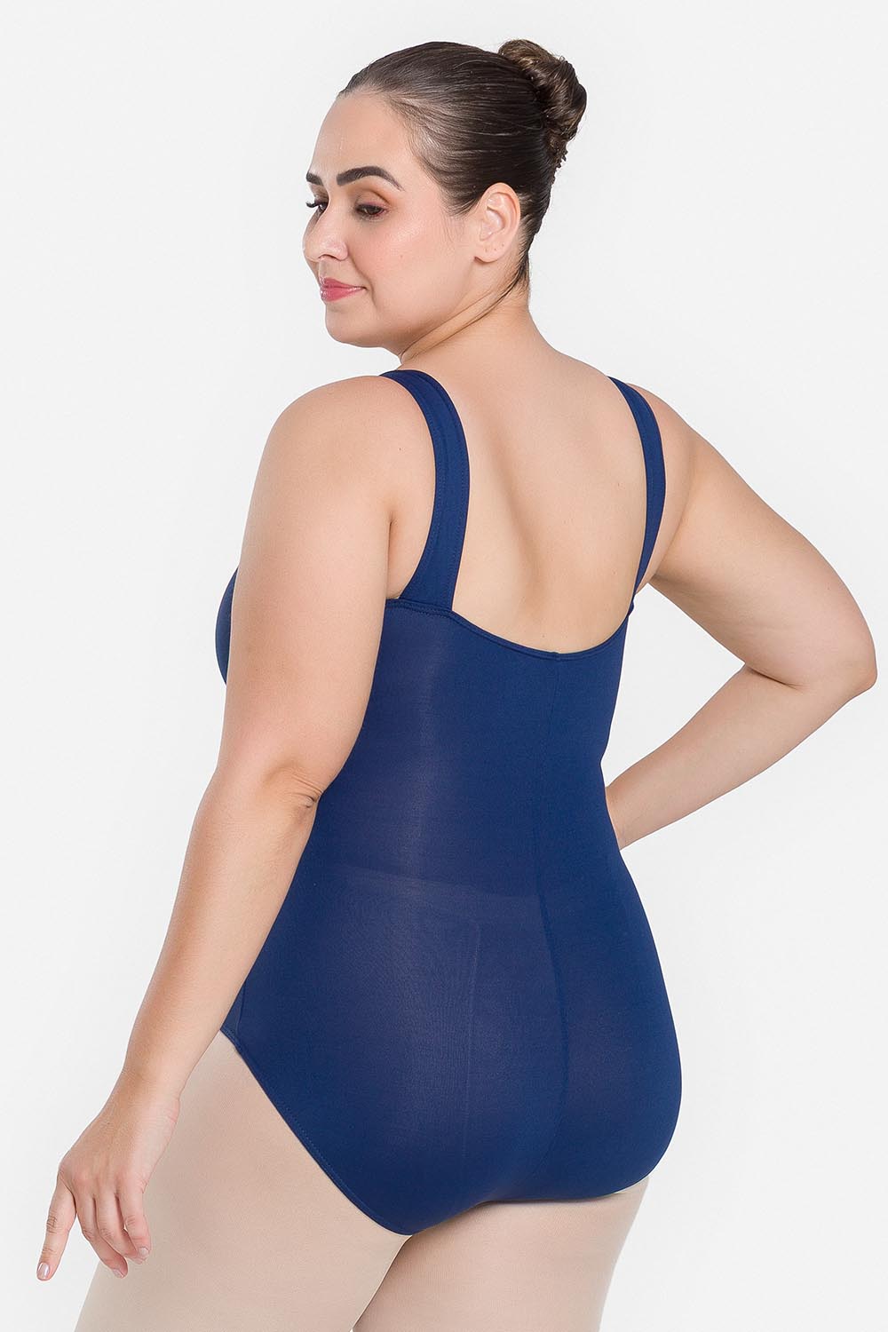 Leotardo femenino adulto en tallas cuvilineas, con moldeado básico de tirantes anchos y escote redondo. Hecho en tela de microfibra con elastano y el exclusivo moldeado Só Dança, que mantiene los dobladillos en sus lugares, dándole a la bailarina total libertad de movimientos y promoviendo la sensación de bienestar y seguridad.