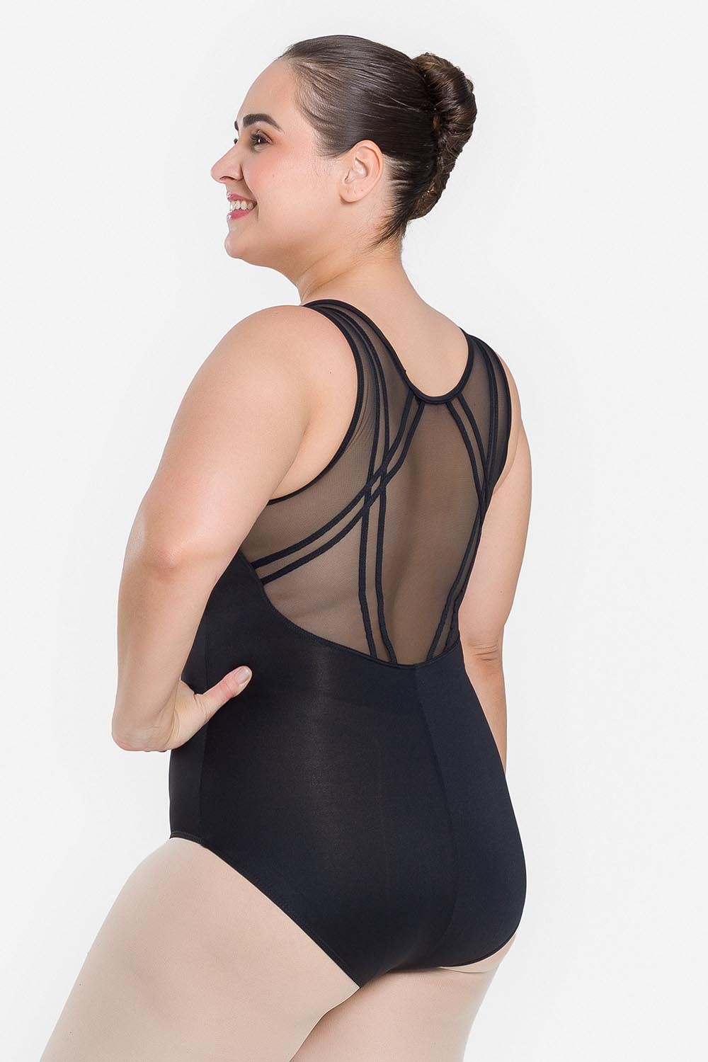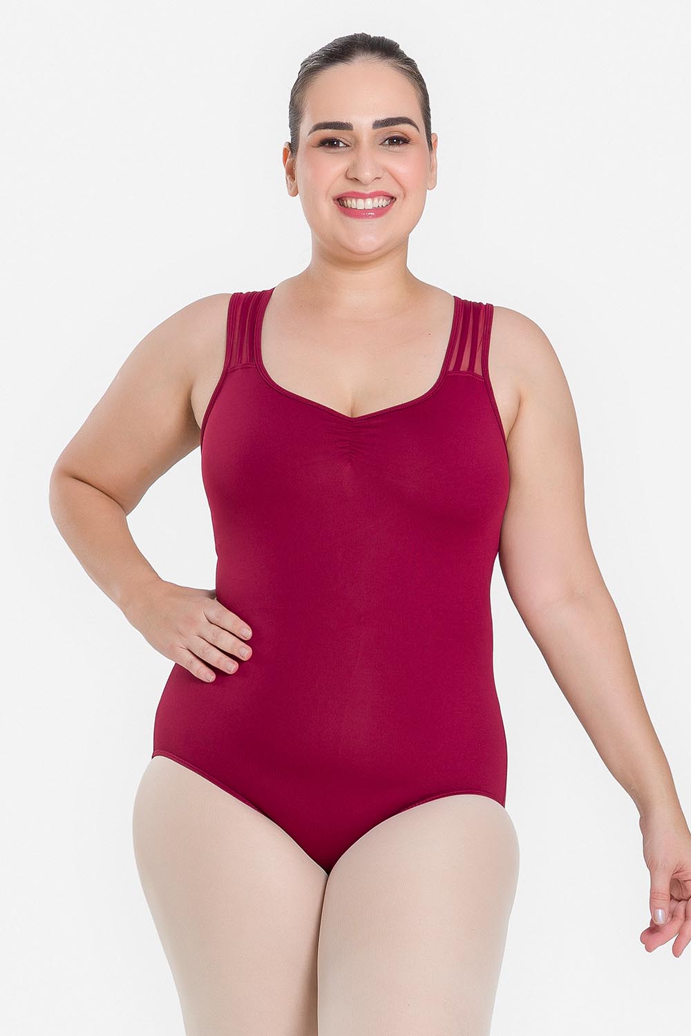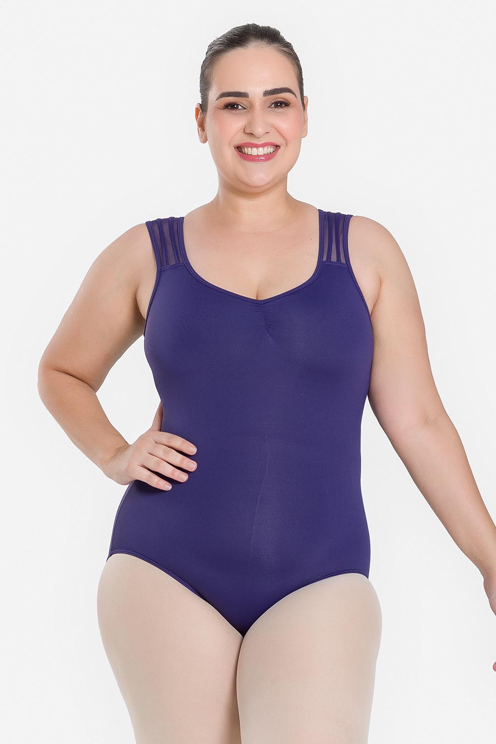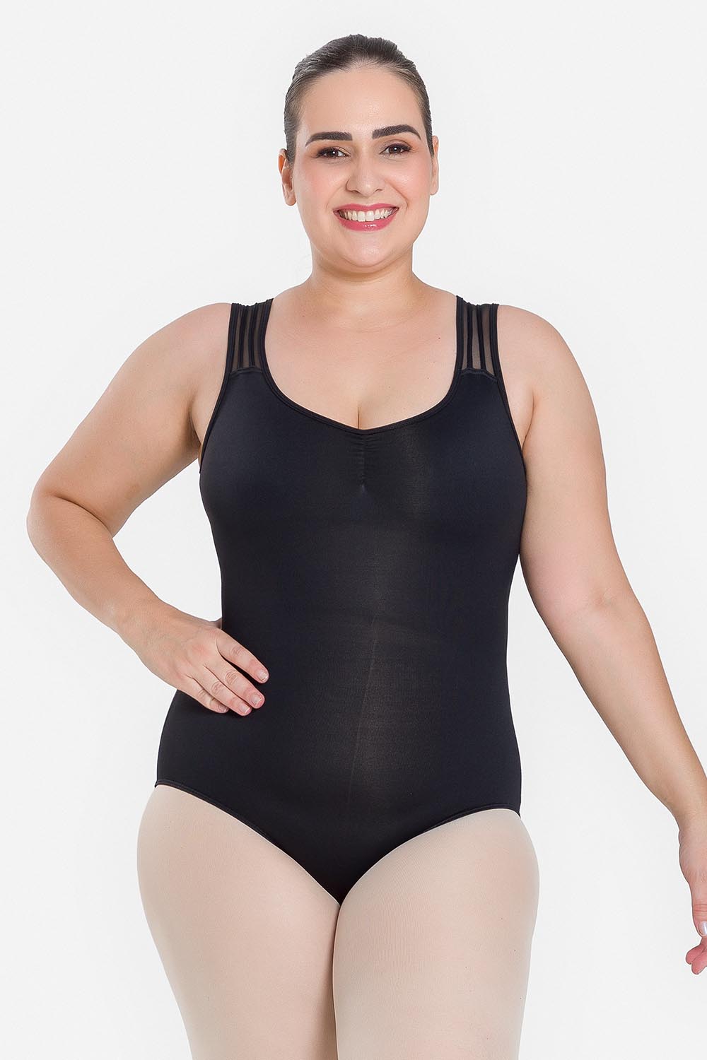 Leotardo femenino adulto en tallas cuvilineas, con moldeado básico de tirantes anchos y escote redondo. Hecho en tela de microfibra con elastano y el exclusivo moldeado Só Dança, que mantiene los dobladillos en sus lugares, dándole a la bailarina total libertad de movimientos y promoviendo la sensación de bienestar y seguridad.