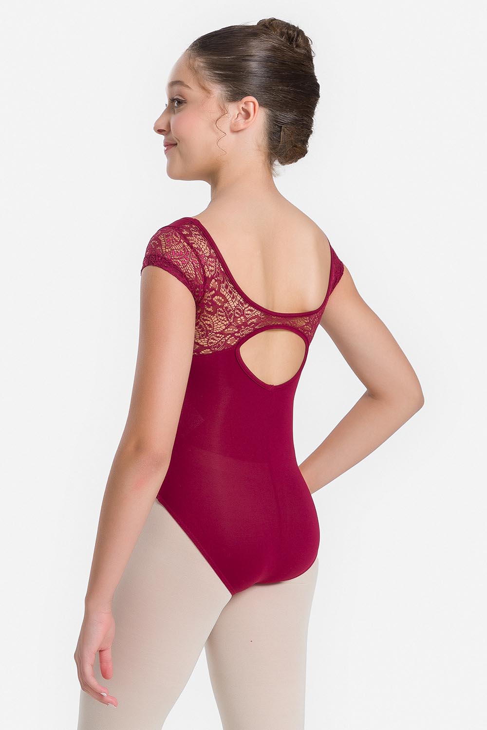 Leotardo femenino infantil con fruncido en el busto, mangas casquillo y parte superior de la espalda en encaje. Hecho en tela de microfibra con elastano en combinación con el exclusivo moldeado Só Dança, que mantiene los dobladillos en sus debidos lugares, favorecendo a la bailarina con total movilidad comodidad y sensación de seguridad.