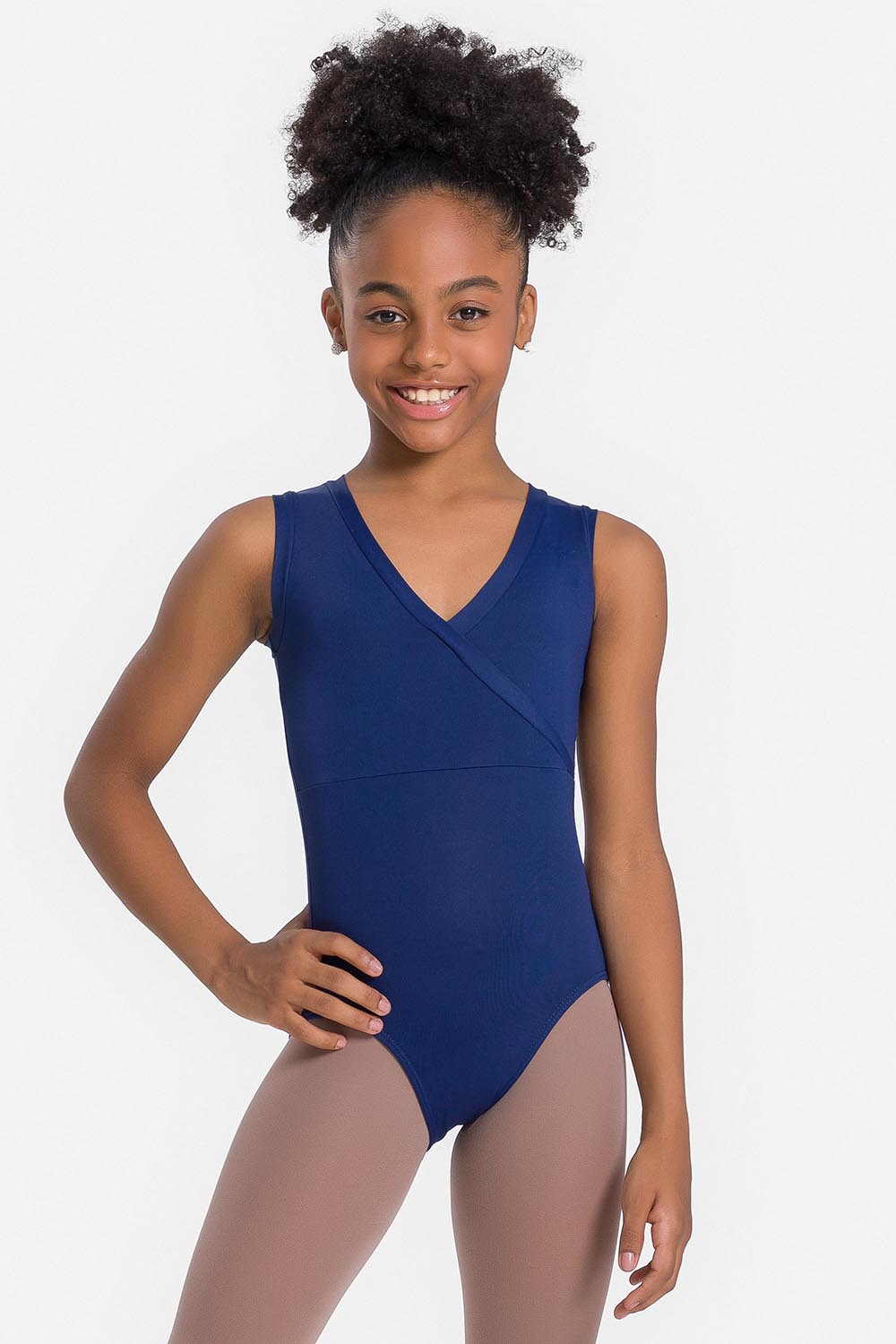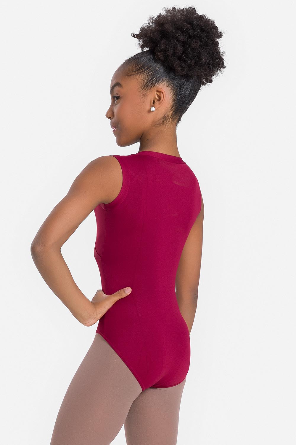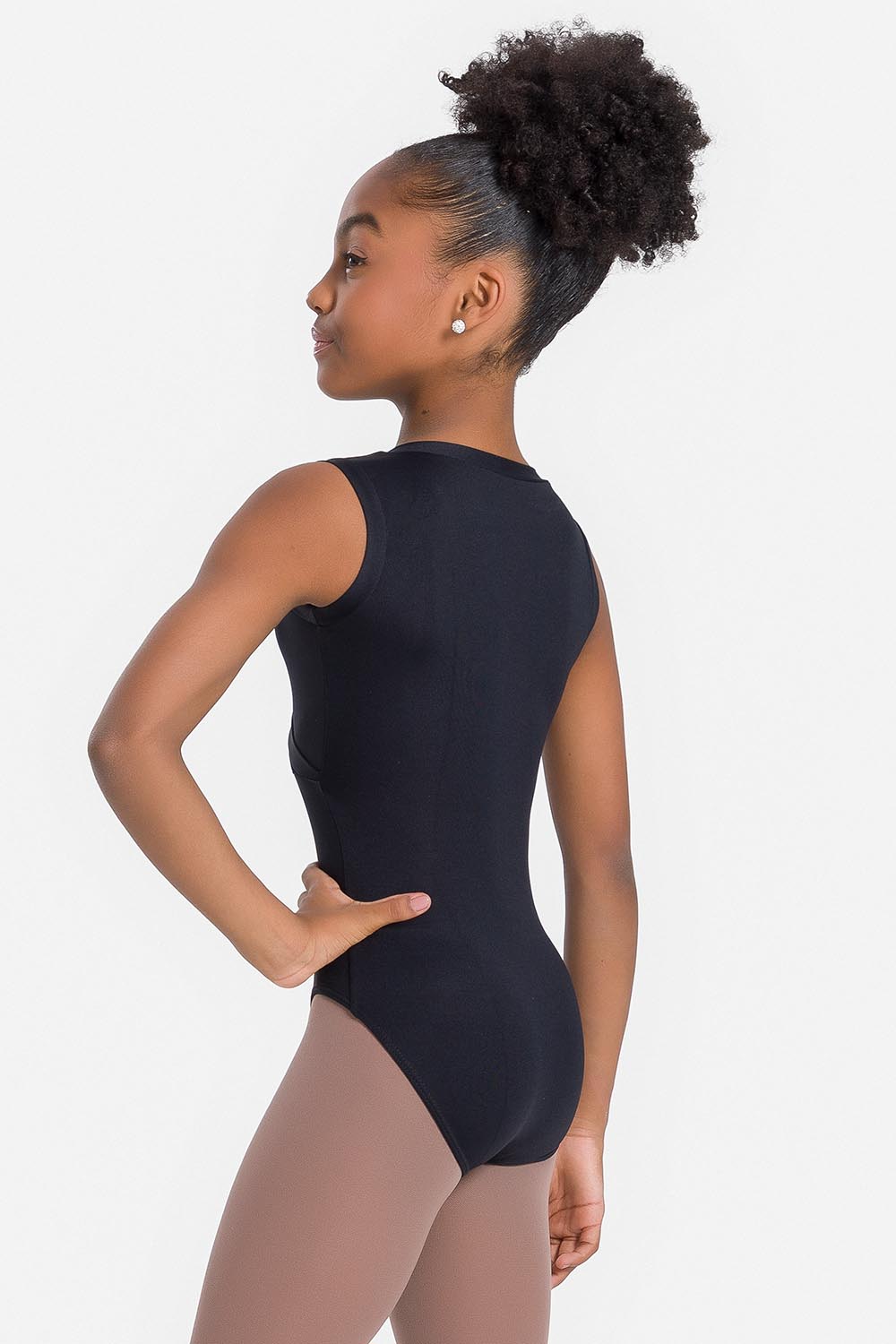 Leotardo femenino infantil sin mangas, con cuello alto, cierre y hoyo en la espalda. Hecho en tela microfibra con elastano en combinación con el exclusivo moldeado Só Dança para que la bailarina se mueva libremente mientras los dobladillos se mantienen fijos en sus debidos lugares, garantizando más comodidad y seguridad.
