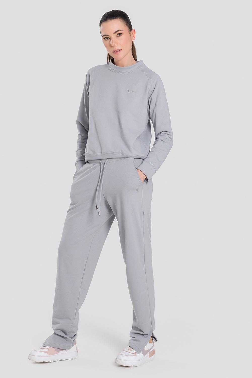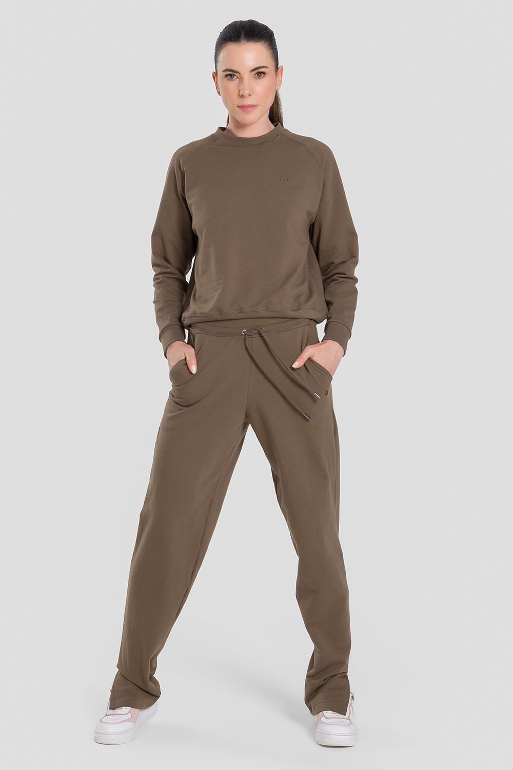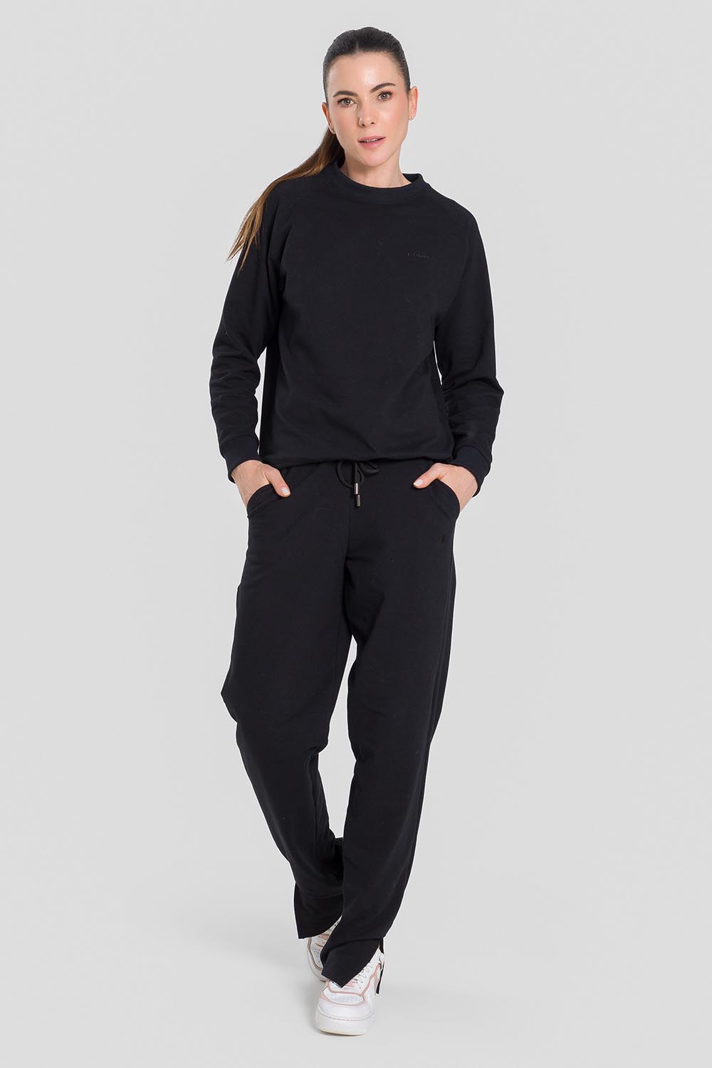 Pantalones femeninos adulto con bolsillos, cordón en la pretina y abertura en los dobladillos. Hechos en tela Sport Fleece, tela súper blanda, compuesta de algodón y poliéster, para calentar y ofrecer comodidad en los días frescos.