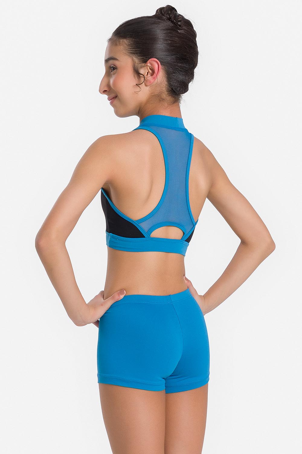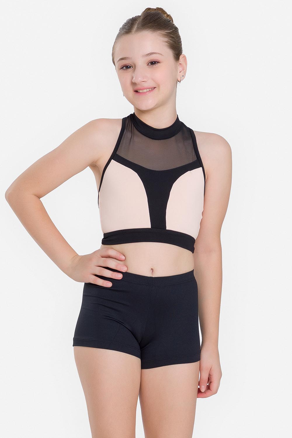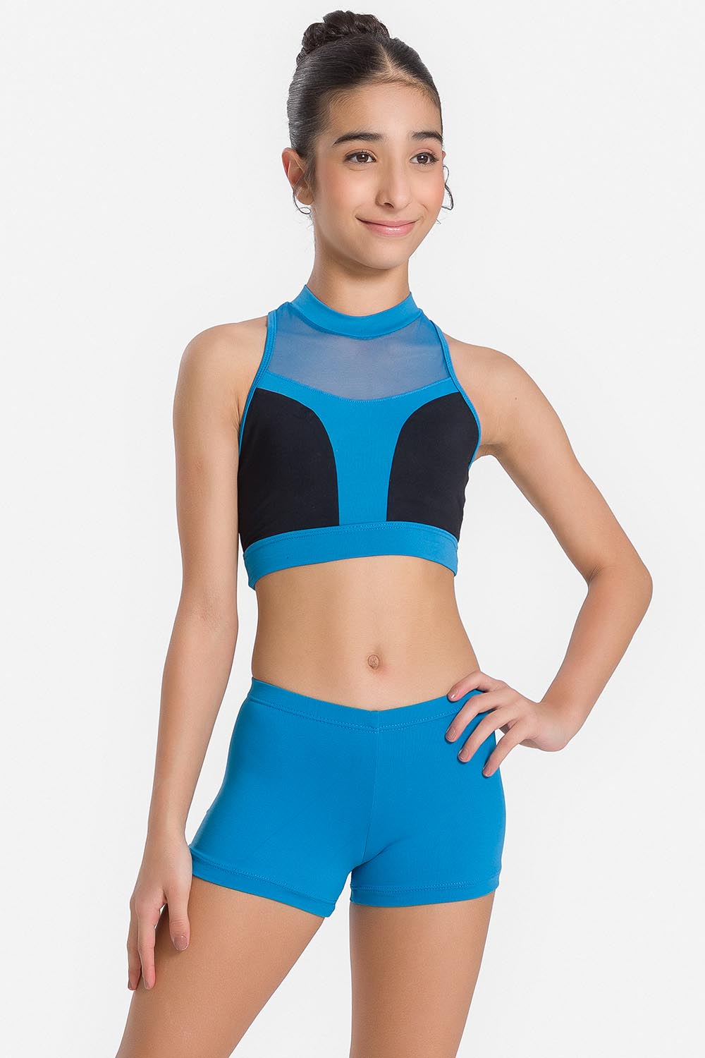 Top infantil con recorte de color contrastante en el busto, dobladillo ancho, cuello alto y espalda de nadador en tul elástico. Hecho en tela microfibra con elastano para brindar el soporte necesario al busto y el exclusivo moldeado Só Dança para que la bailarina se mueva libremente mientras los dobladillos se mantienen fijos en sus debidos lugares, garantizando más comodidad y seguridad.