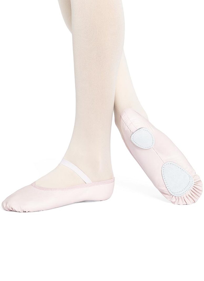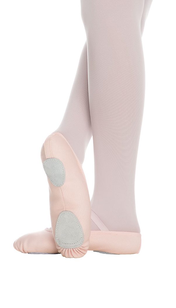 Zapatilla media punta con suela repartida, en tallas infantiles. Hecha en material sintético con suela y talón de gamuza en color natural, elástico del empeine ya cosido, forro de algodón y cinta del borde con cordón elástico para ajuste personalizado.