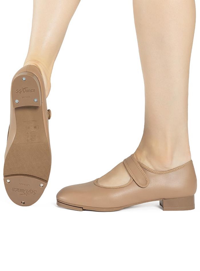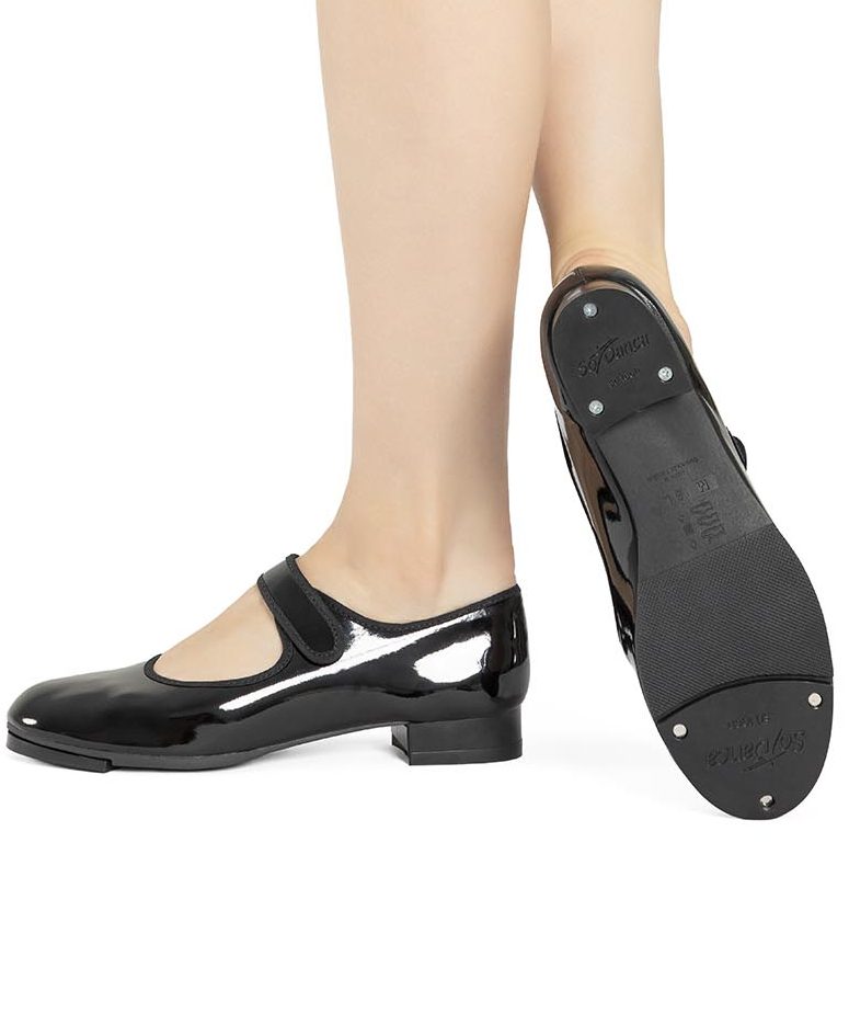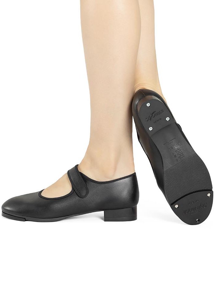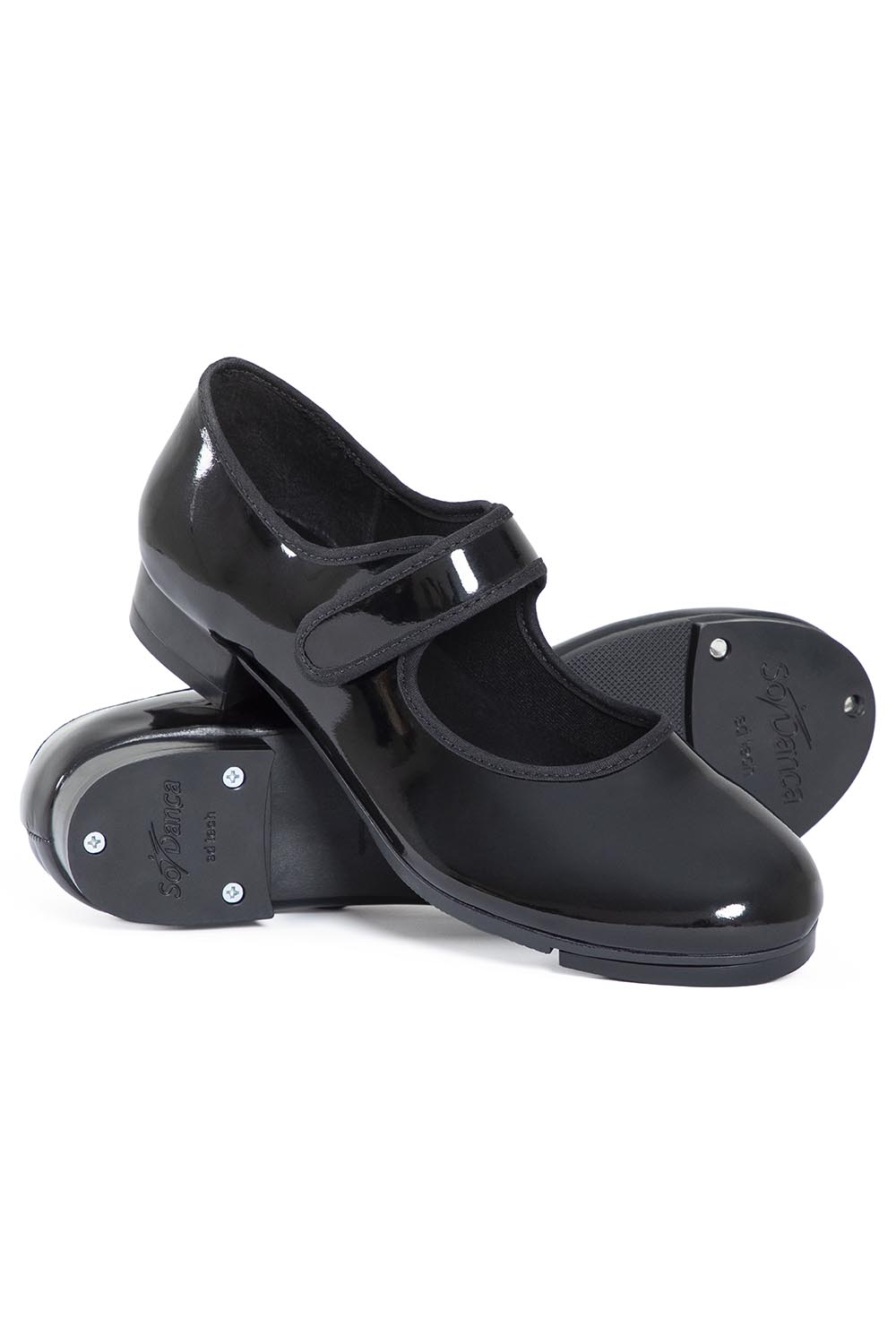 Zapato infantil para los niveles principiante e intermedio de tap o claqué, hecho en cuero sintético, con cierre de velcro para hacer más fácil el ponerse y quitarse, suave costura en todo el borde, suela sintética entera flexible y chapitas plásticas sujetadas con remaches en la parte delantera y tornillos en el talón.